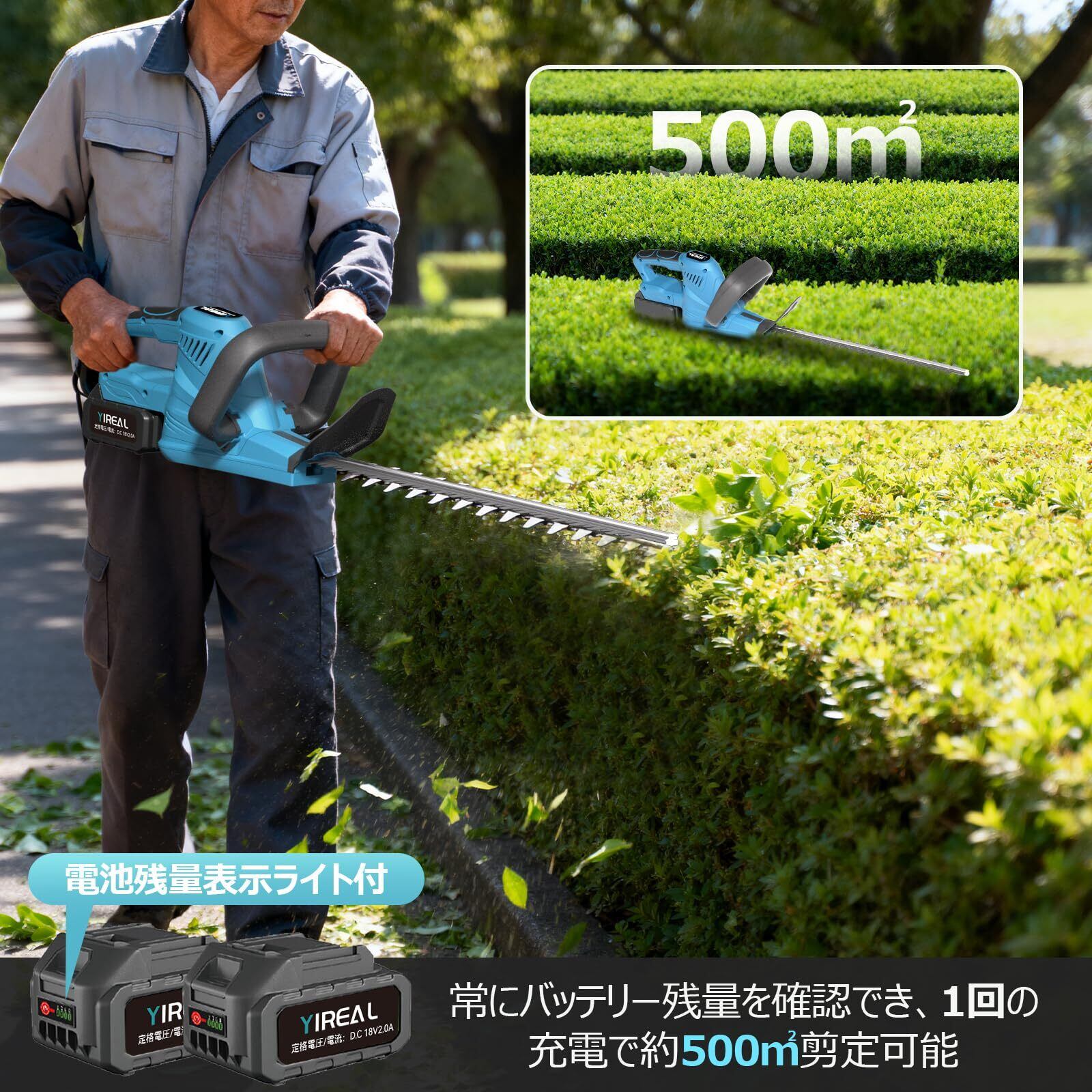 【特別価格】ヘッジトリマー 【山本造園会社監修】 剪定バリカン 生垣バリカン PSE認証済 ブラシレスモーター搭載 刈込幅51cm切断径18mm両刃駆動 高速往復刈り 高切断力 組立不要 低騒音 軽量 使い易い 18Vマキタバッテリー対応可 2個4000mAh残量表示電池付 日本語取扱説明書 2025新登場庭木や生垣用 電動ヘッジトリマー