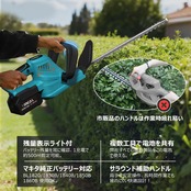 【PSE認証済&残量表示付きバッテリー】残量表示機能付きPSE認証済の4000mAh大容量バッテリーを2本付属。充電状況がひと目でわかり、1回の充電で約500㎡の生垣をカット可能です。さらに、マキタ製バッテリーとの互換性もあり、当社の電動バサミや延長ポールやチェーンソーなどの電動工具とも共用できます。充電器ももちろんPSE認証済みで安全性抜群。