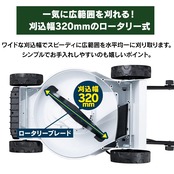 ◆簡単で安全! 高い操作性・レバーハンドルだけの簡単操作。 操作は簡単、レバーハンドルを握るだけ。 レバーハンドルから手を離すと運転が停止します。一気に広範囲を刈れる! 刈幅32cmのロータリー式 ワイドな刈幅でスピーディに広範囲を水平均一に刈り取ります。 シンプルでお手入れしやすいのも嬉しいポイント。刈高調整3段階(25~65mm) 前輪後輪のシャフトの位置で刈込高を調整します。