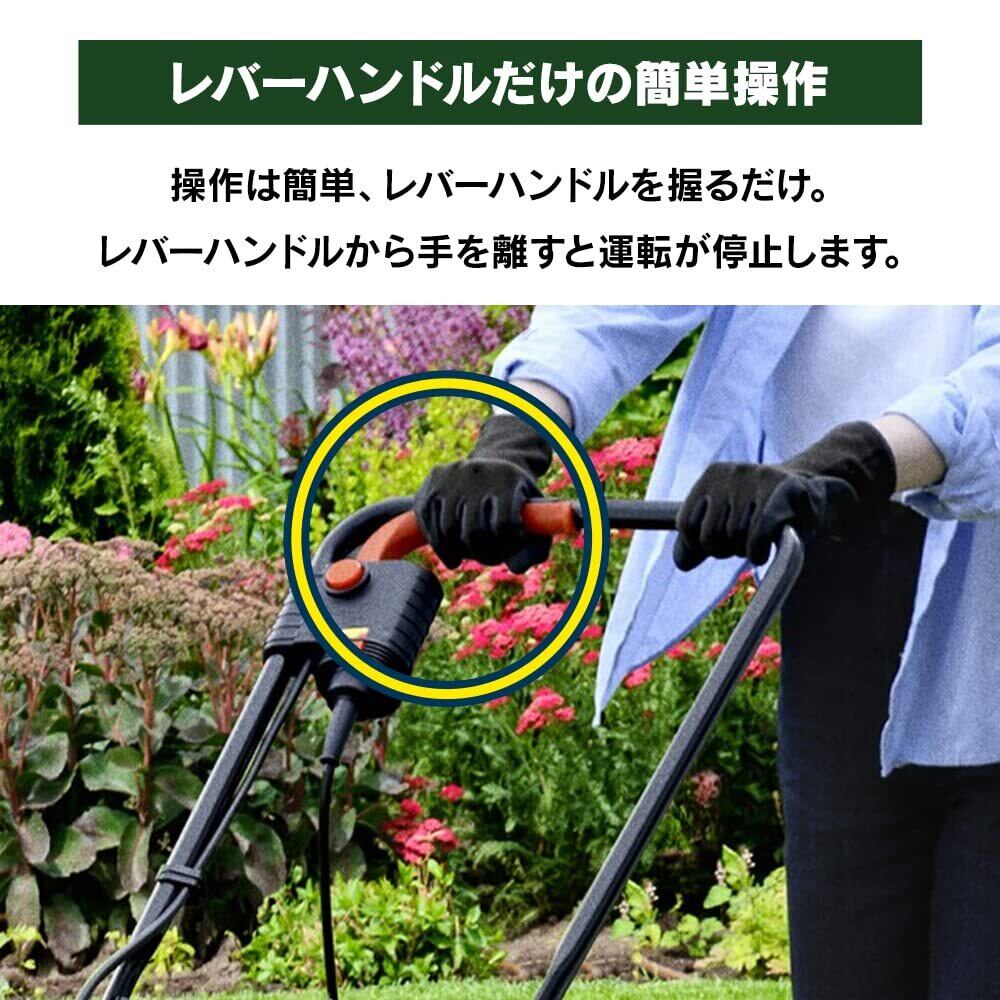 気持ち良くグングン刈れる! お手入れラクラク、手軽なロータリー式。スピーディに芝刈りができます。安心の安全ロックとブレーカー付き・簡単操作レバーハンドル・バッテリー切れの心配なし、AC電源式。小回りが利く軽量コンパクト7kg・大容量30Lのグラスキャッチャー。お手入れ楽々ロータリー式
