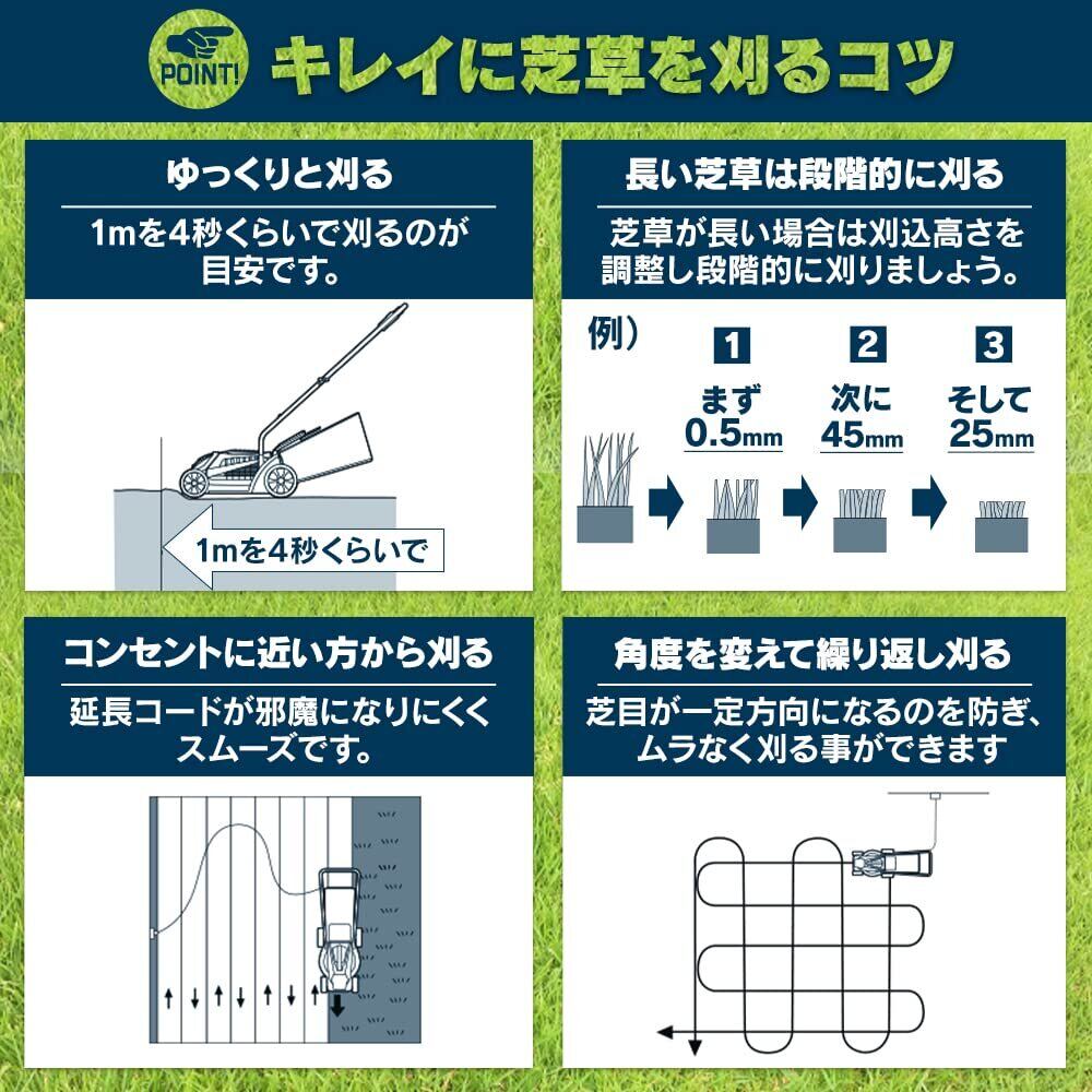 ◆キレイに芝草を刈るコツはゆっくりと刈る 1mを4秒くらいで刈るのが目安です。長い芝草は段階的に短く刈る 芝草が長い場合は刈込高さを調整し段階的に刈りましょう。コンセントに近い方から刈る 延長コードが邪魔になりにくくスムーズです。角度を変えて繰り返し刈る 芝目が一定方向になるのを防ぎ、ムラなく刈る事ができます。◆大容量30Lのグラスキャッチャー刈った草が集まるグラスキャッチャーは30Lと大容量。捨てに行く回数減で効率UP! 便利なワイヤーハンドル付き。