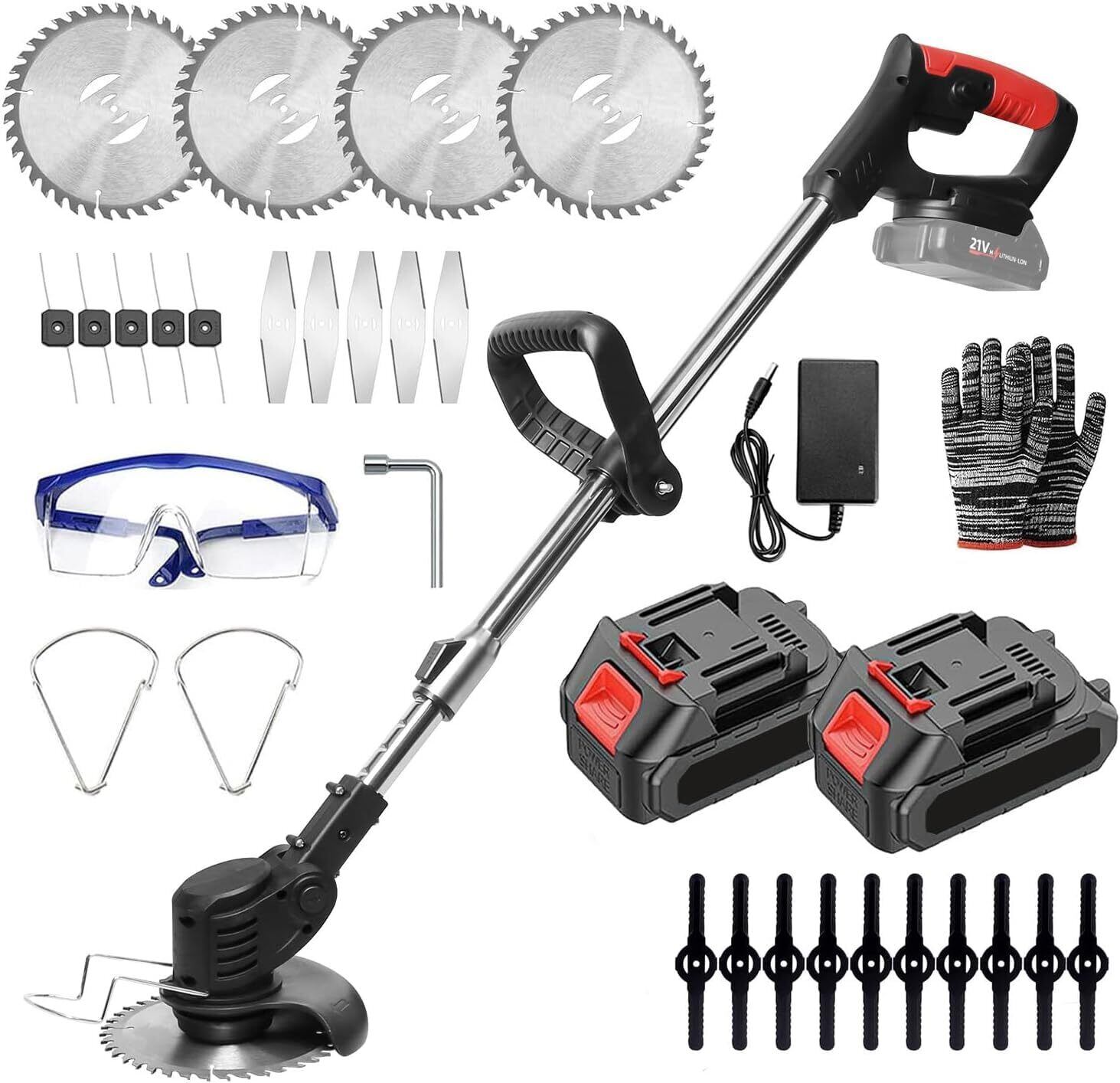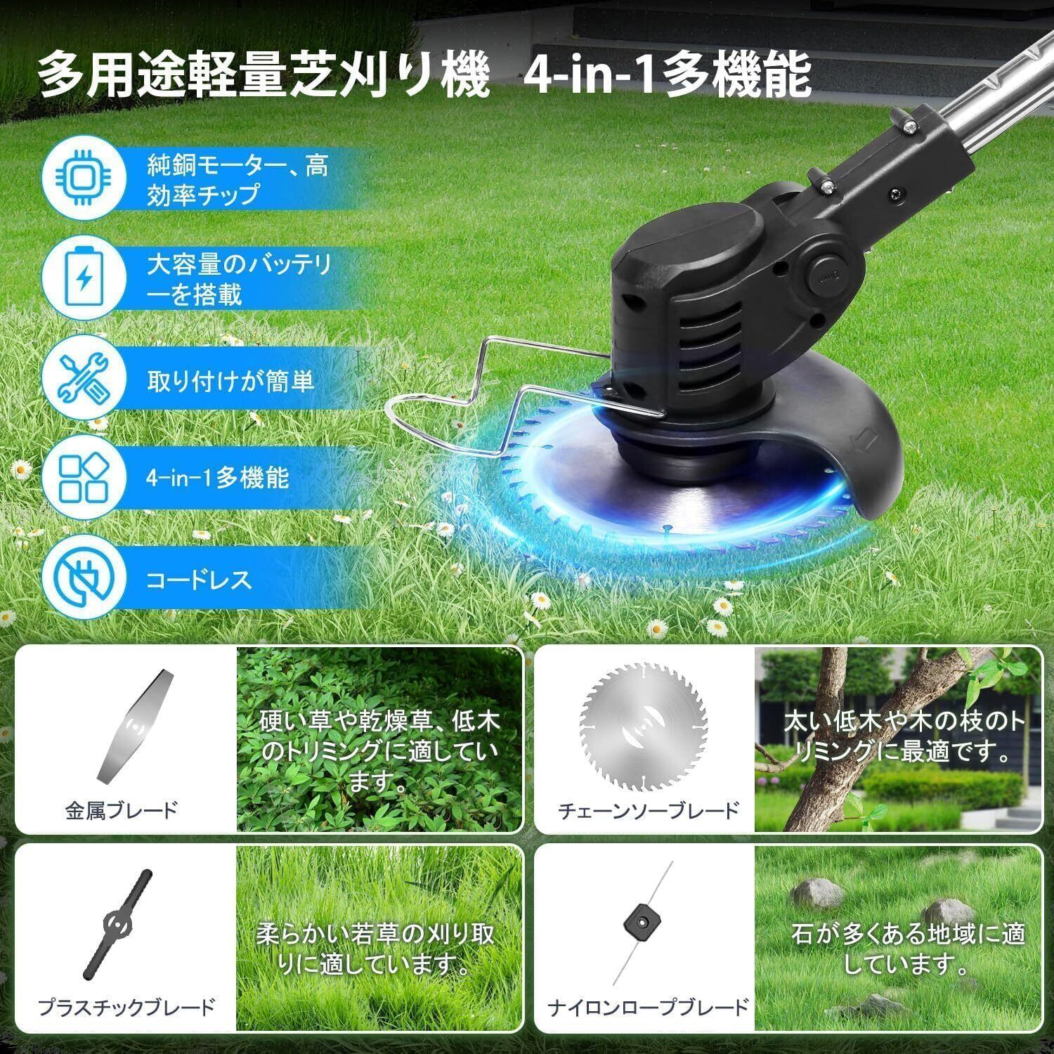 ️ 【安心の安全設計&豊富なアタッチメントで多彩な作業をカバー】 ️ 二重起動装置とガードカバーで、万が一の際も安全を確保。 4種類の異なるカッティングブレード(ナイロンブレード、スチールブレード、チップソーなど)を同梱!芝刈りはもちろん、枝切り、雑草処理、植木の手入れまで、一台で多彩なガーデニング作業に対応します。 充実の10点セット(バッテリー2個、各種ブレード、保護メガネ、手袋など)ですぐ始められ、アフターサポートも万全!ご不明点はお気軽にご連絡ください。