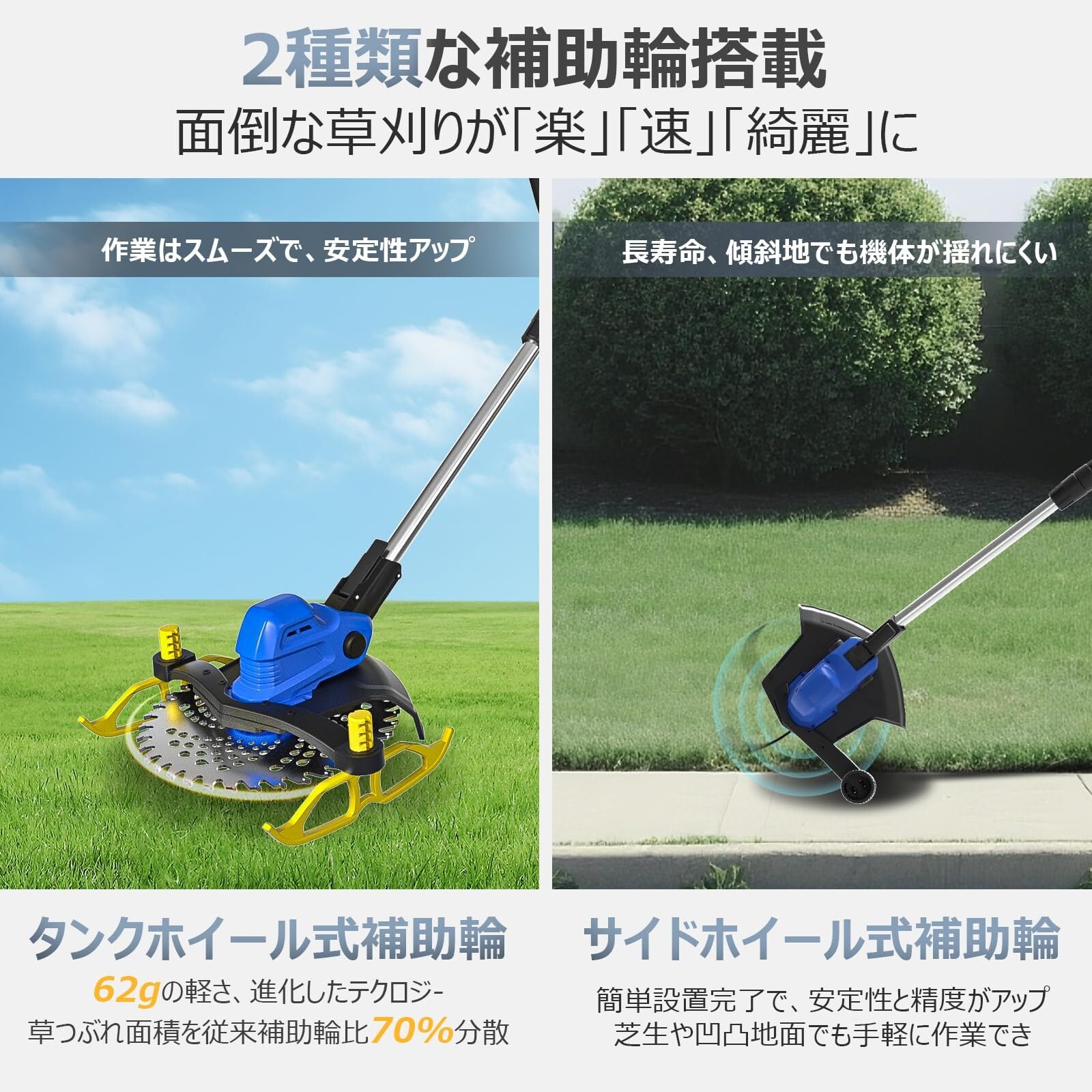 充電式草刈り機【2025年新登場・刈刃径255mm・高さ5段調節タンクホイール&サイド補助輪付き】1台4役 21V コードレス電動草刈機 電量表示 PSE認証4000mAhバッテリー2個 上下90度左右180度調整ヘッド 300mm保護カバー 替刃4種 丸鋸刃 三枚刃 ナイロンコード 内蔵4m替えコード 補助ハンドル 肩掛けバンド 低騒音 安全 女性簡単操作 草刈り 芝刈り 縁刈り 除草 園芸