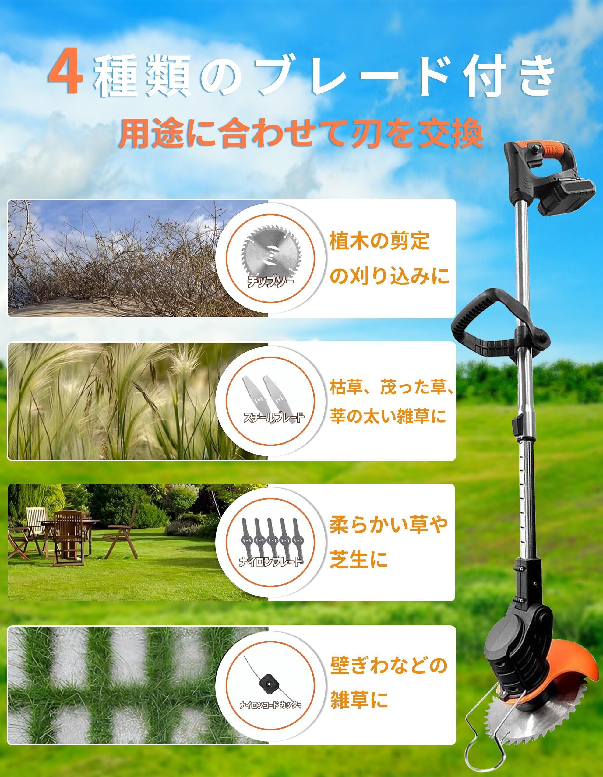 【KAKA】質保一年間 2025新登場 草刈り機 充電式 コードレス 草刈機 大容量バッテリー2個付属 軽量 電動草刈り機 高効率チップ 多地形 伸縮 角度調整 4種類の替刃で芝生 枝切り 畑 雑草 植木対応 家庭用 日本語説明書付