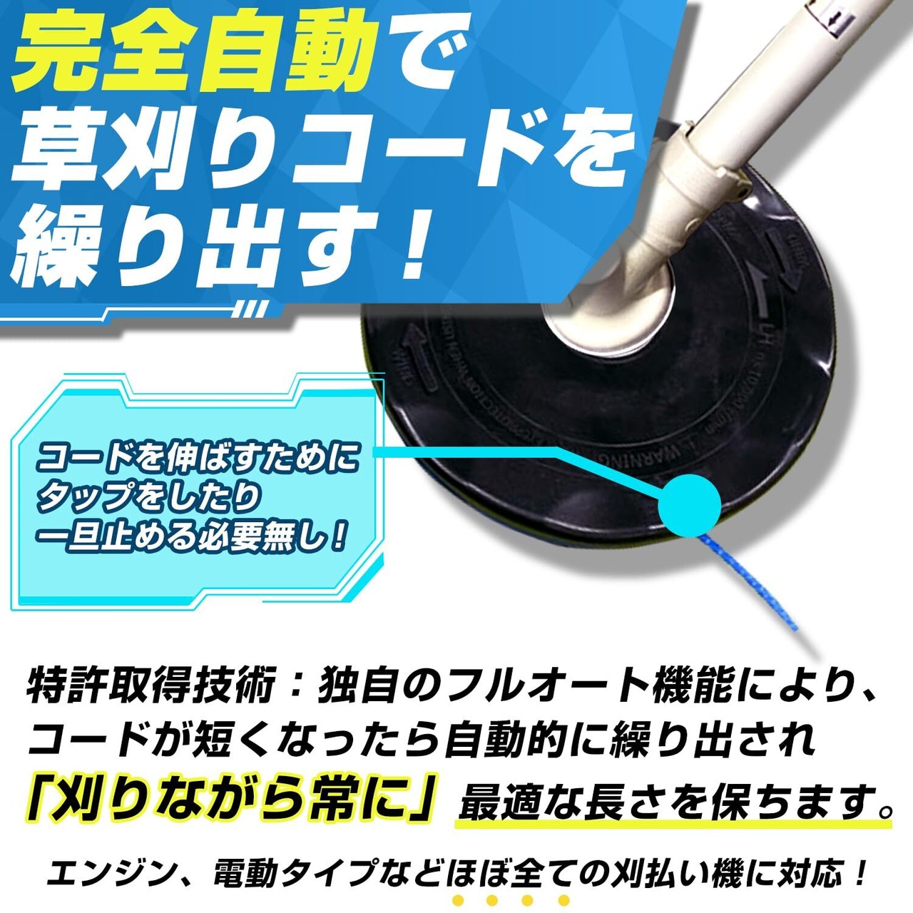 今までのカッターには無い新機能! ①完全自動でコードを繰り出し! ②ヘッドの分解不要!超カンタンなコード交換! ③独自開発ディスクでハイパワーな刈り心地! ※チップソーと違って安心・安全 ツイストコードによる静穏性の向上 ツイスト形状により切れ味抜群 地面スレスレを刈れる薄型設計。形状バランスが取れているため低振動 部品点数が少なく手間いらず。 【本体仕様】 ・独自開発のフルオート機能により、コードが短くなったら自動的に繰り出しされ一 定の長さを保ちます。(取得技術) ・本体サイズ:直径約φ13cm×全高約3.65㎝/本体重量:382 g/取付穴:直径 約12.3mm/取付け部:25.5mm/使用工具径30mm以下 【特徴】 ・国内ほぼ全ての一般的な電動式刈払機と、エンジン式刈払い機に使用可能なナイロンコードカッターです。(一部使用できない機種があります) 連続作業ができるフルオート繰り出し式なので、作業中ナイロンコードが短くなるとコードが自動的に繰り出されます。 ・独自のディスク形状により先端部のコード長さが保たれ切断性能が飛躍的に向上します。また飛散防止効果もあります。 【ヘッドの分解不要!超カンタンなコード交換】 本製品は刈払機に付けた状態でコード交換が可能!手間いらず。 コードを入れて数回カチカチ回すだけ※実は…国内刈払い機の2大巨頭、マキタ・山善の ナイロンカッターヘッドはダイアトップが製造しています! ※※注意:取付不可機種※※【京セラ】AK3000・BK-1802L1【工進】PBC-3650-AAB・SBC-3650B【マキタ】MUR193DWF・MUR189D・MUR193DZ・MUR140D