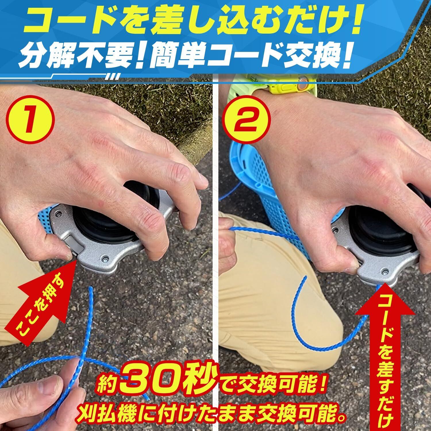 ①コードを差し込むだけで使える:分解不要!簡単コード交換!コードホルダーを押してナイロンコードを差し込むだけ!