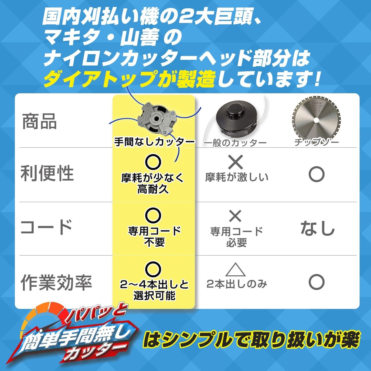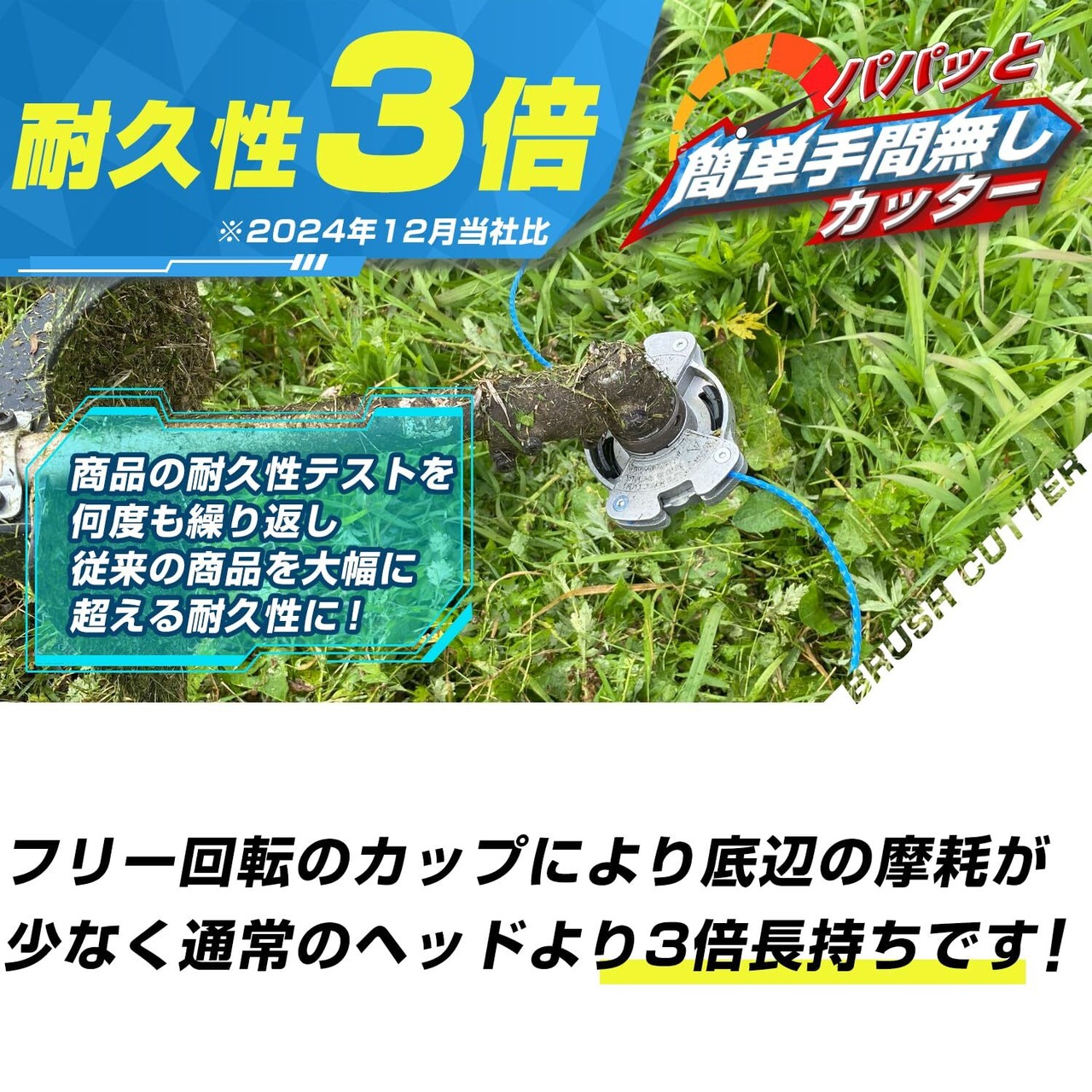 ②耐久性3倍:国内刈払い機の2大巨頭、マキタ・山善のナイロンカッターヘッドはダイアトップが製造しています!フリー回転のカップにより底辺の摩耗が少なく 通常のナイロンヘッドより摩耗しにくく3倍長持ちです!※当社調べ