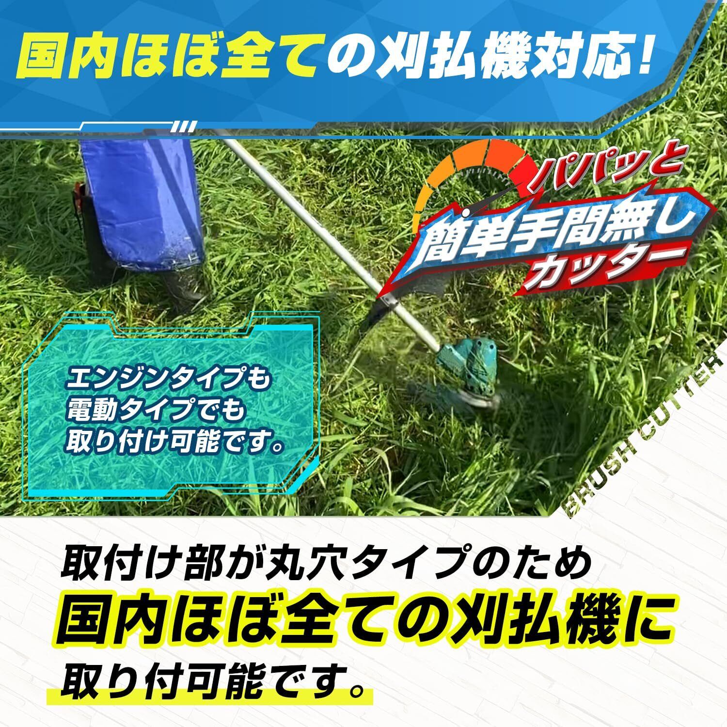 ③国内ほぼ全ての刈払い機対応:取付け部が丸穴タイプのため、国内ほぼ全ての刈払機に取り付可能です。