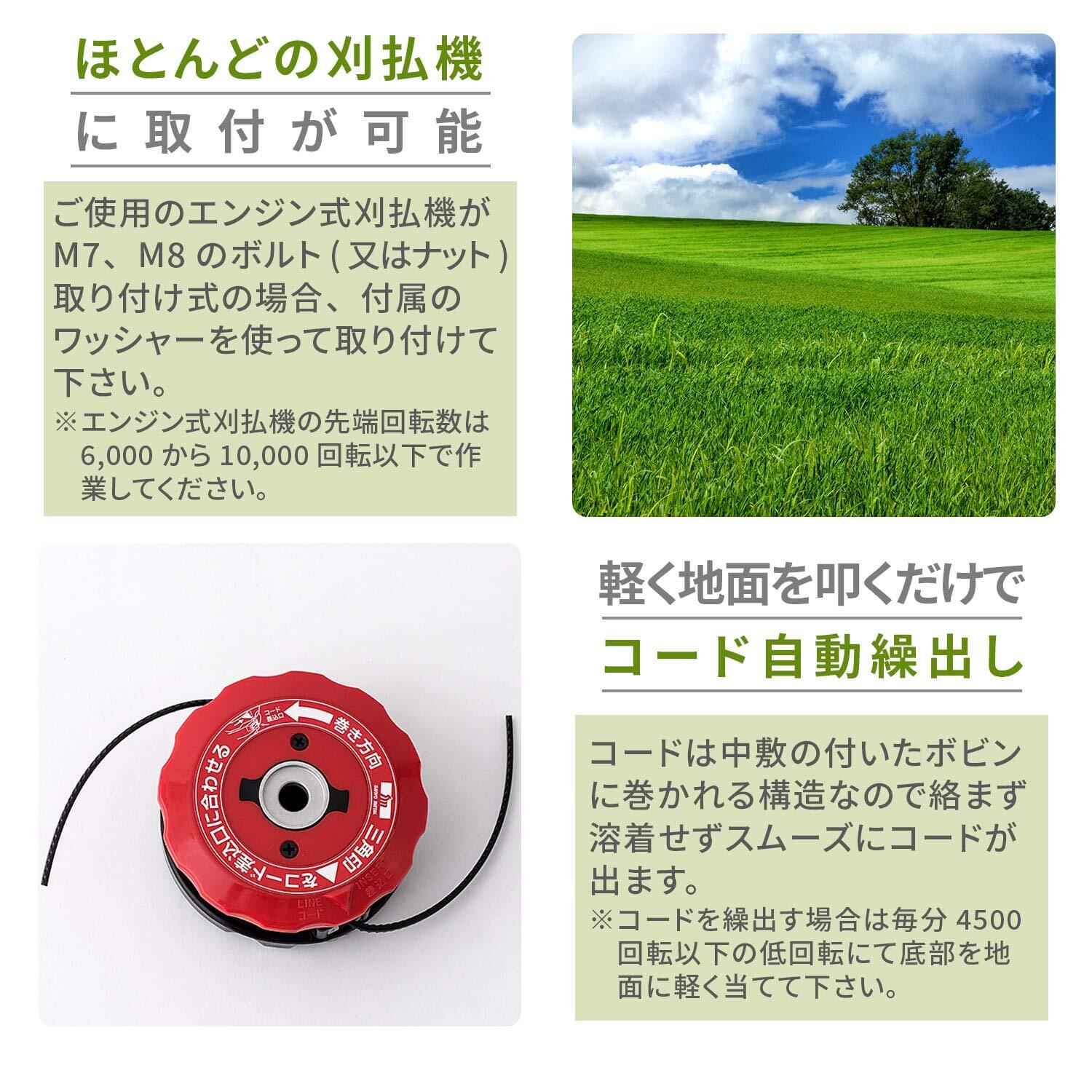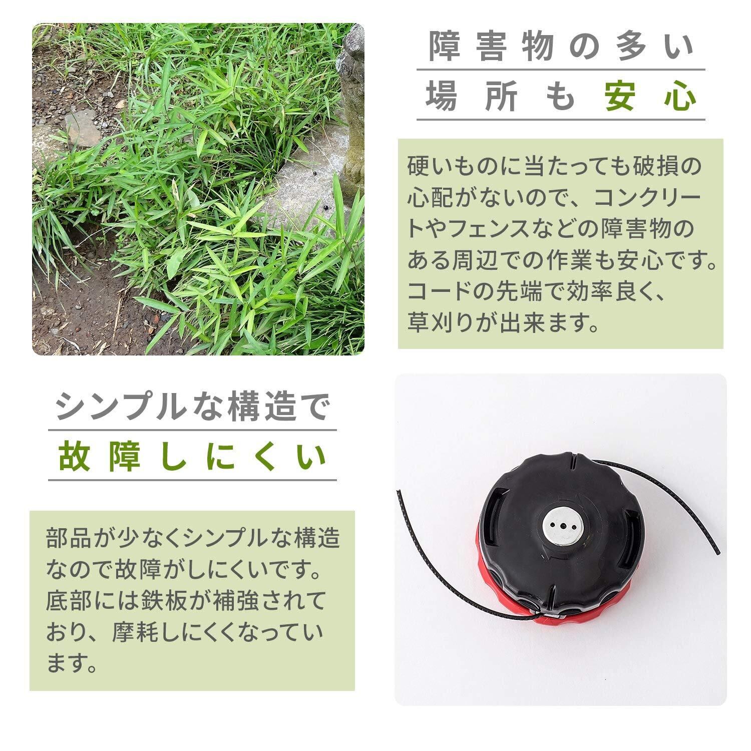 【特徴】分解なしでコードが巻き取れるナイロンカッターです。軽く地面を叩くだけでコード自動繰出しされます。コードは中敷の付いたボビンに巻かれる構造なので絡まず溶着せずスムーズにコードが出ます。硬いものに当たっても破損の心配がないので、コンクリートやフェンスなどの障害物のある周辺での作業も安心です。コードの先端で効率良く、草刈りが出来ます。部品が少なくシンプルな構造なので故障がしにくいです。底部には鉄板が補強されており、摩耗しにくくなっています。