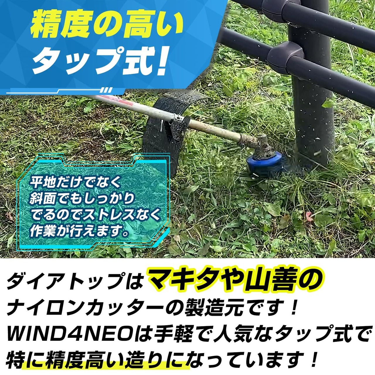 ①精度の高いタップ式:ダイアトップはマキタや山善のナイロンカッターの製造元です!WIND4Neoは手軽で人気なタップ式で特に精度の高い造りになっています!