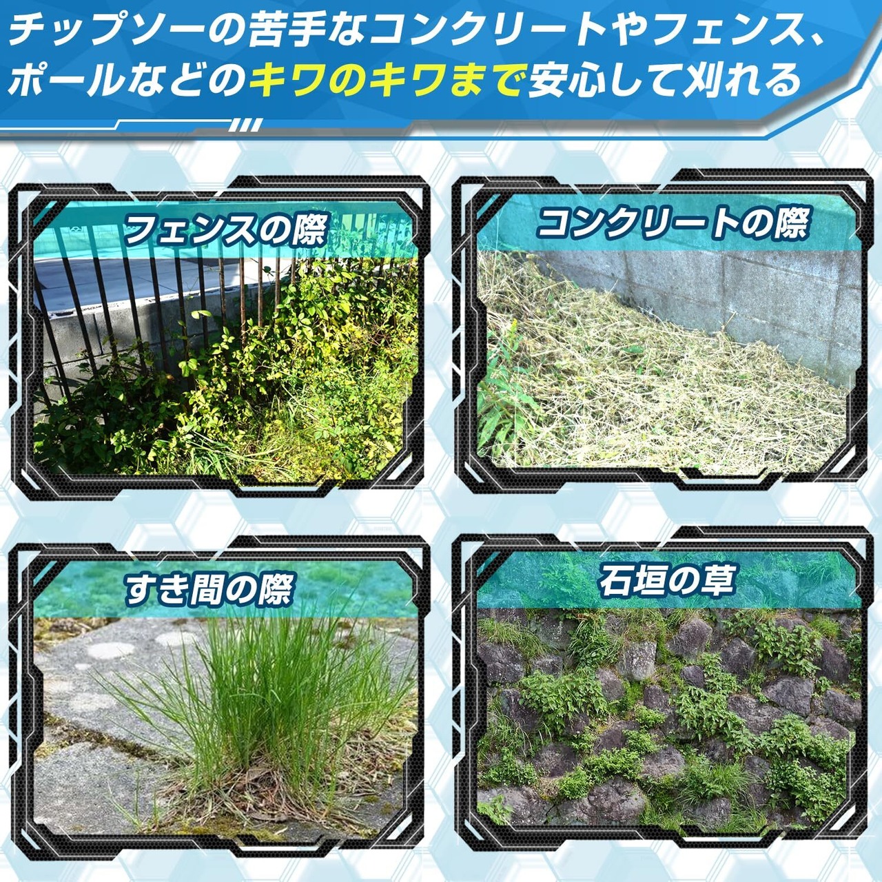刈れる場所は・フェンスの際・隙間の草・コンクリートの際など様々なシーンで利用可能です。