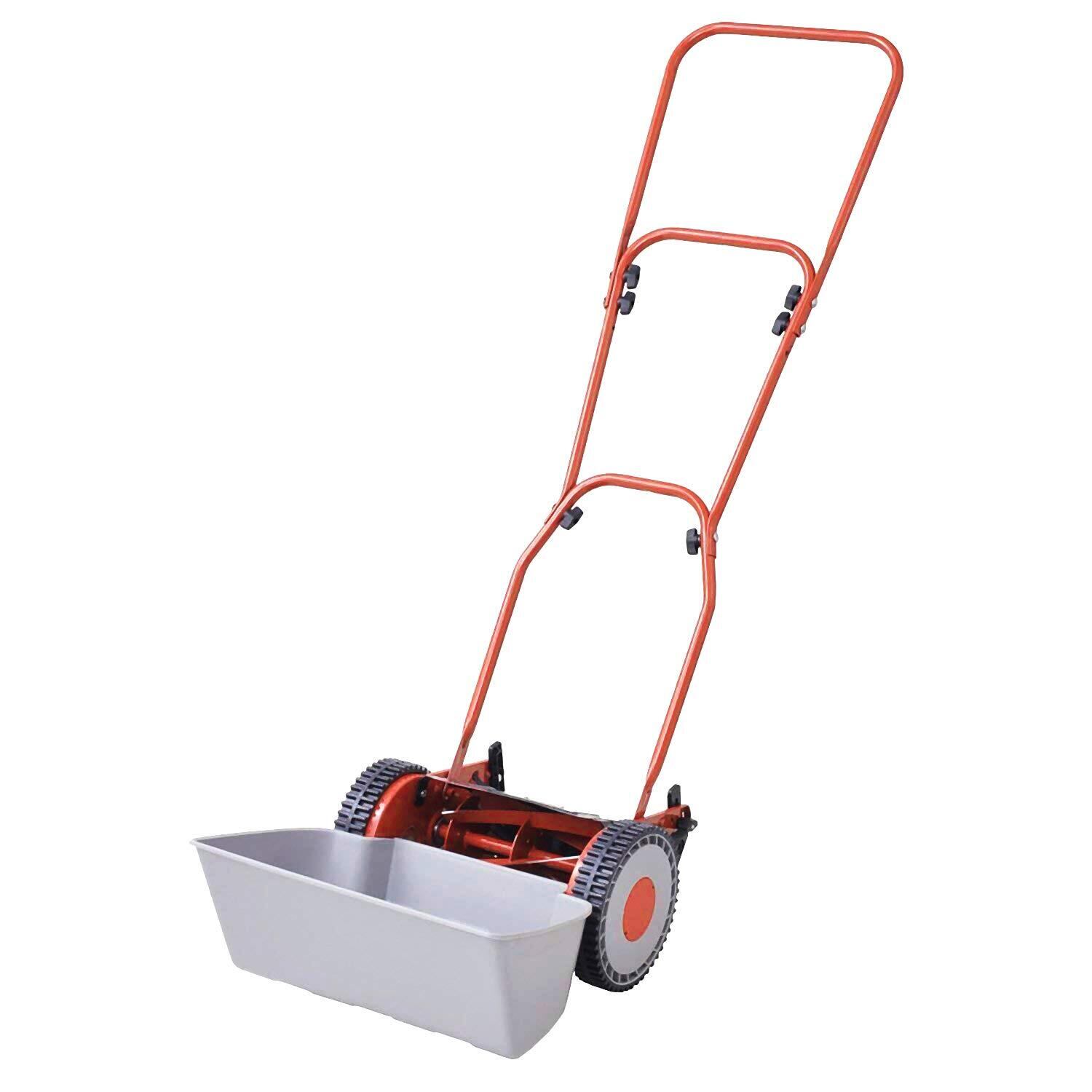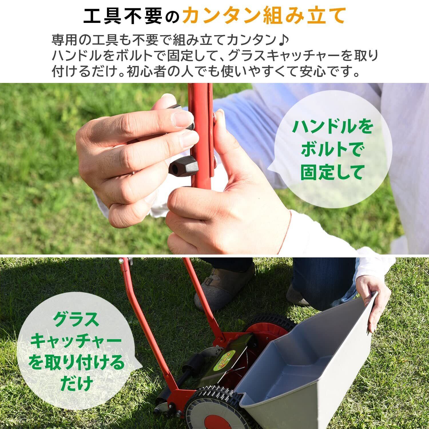 【特徴】音が気になりにくい手動式の芝刈り機です。組み立て簡単で専用の工具もいらず、ハンドルをボルトで固定してグラスキャッチャーを取り付けるだけですぐに使用できます。少しの力でスイスイ刈れ、初心者の方でも使いやすくて安心です。刈込の高さは約10・16・23・30・36mmの5段階に調節でき、ハンドルの高さはお好みに合わせて、約114.5・118cmの2段階に調節できます。持ちやすい取っ手は軽く押すだけですいすい芝を刈り取ります。安定感抜群の大きな車輪で芝刈り作業もスムーズです。前面につけたグラスキャッチャーに刈り取った芝が効率良く入るので作業もラクラクです。