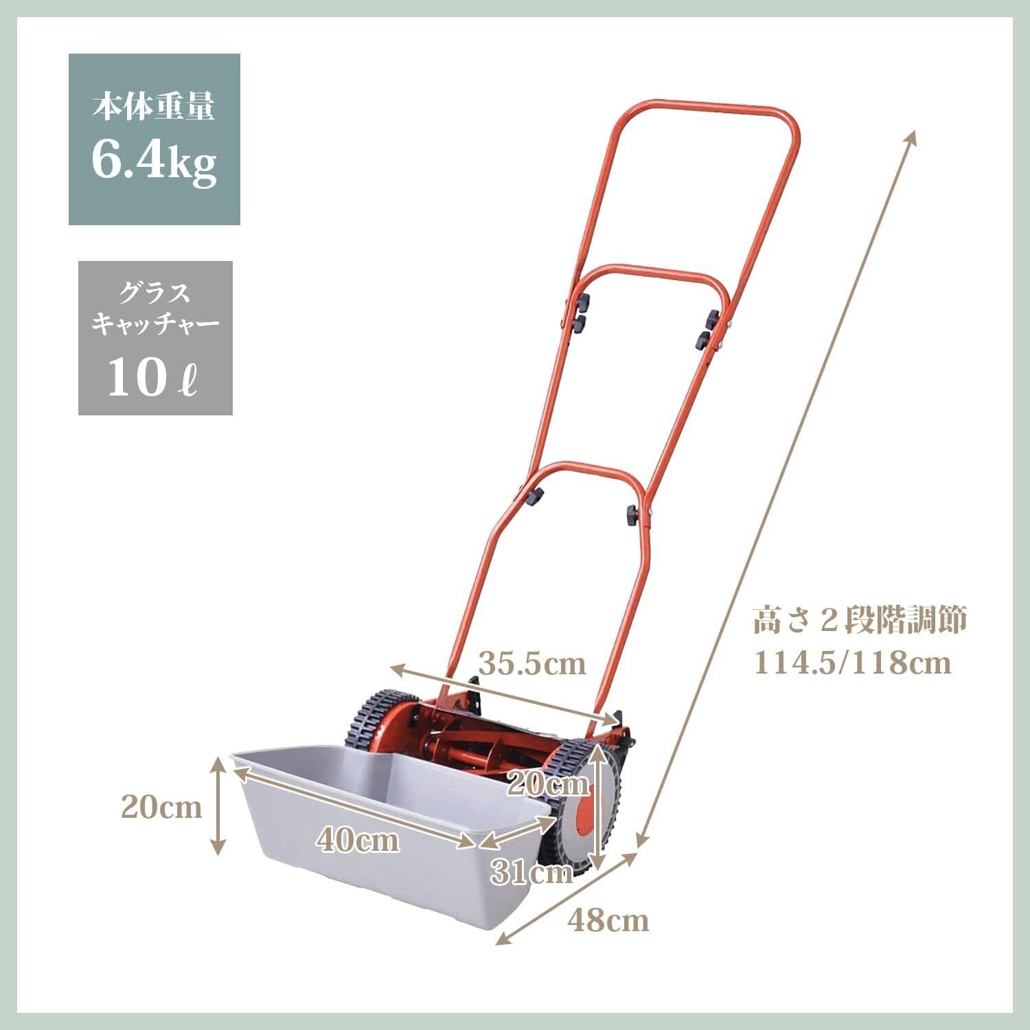 【仕様】本体サイズ:幅35.5×奥行48-120×高さ114.5/118cm /重量:約6.4kg/刈込幅:約200mm/刈込高さ:5段階調節可能(約10・16・23・30・36mm)/付属品:グラスキャッチャー(プラスチックトレイ)