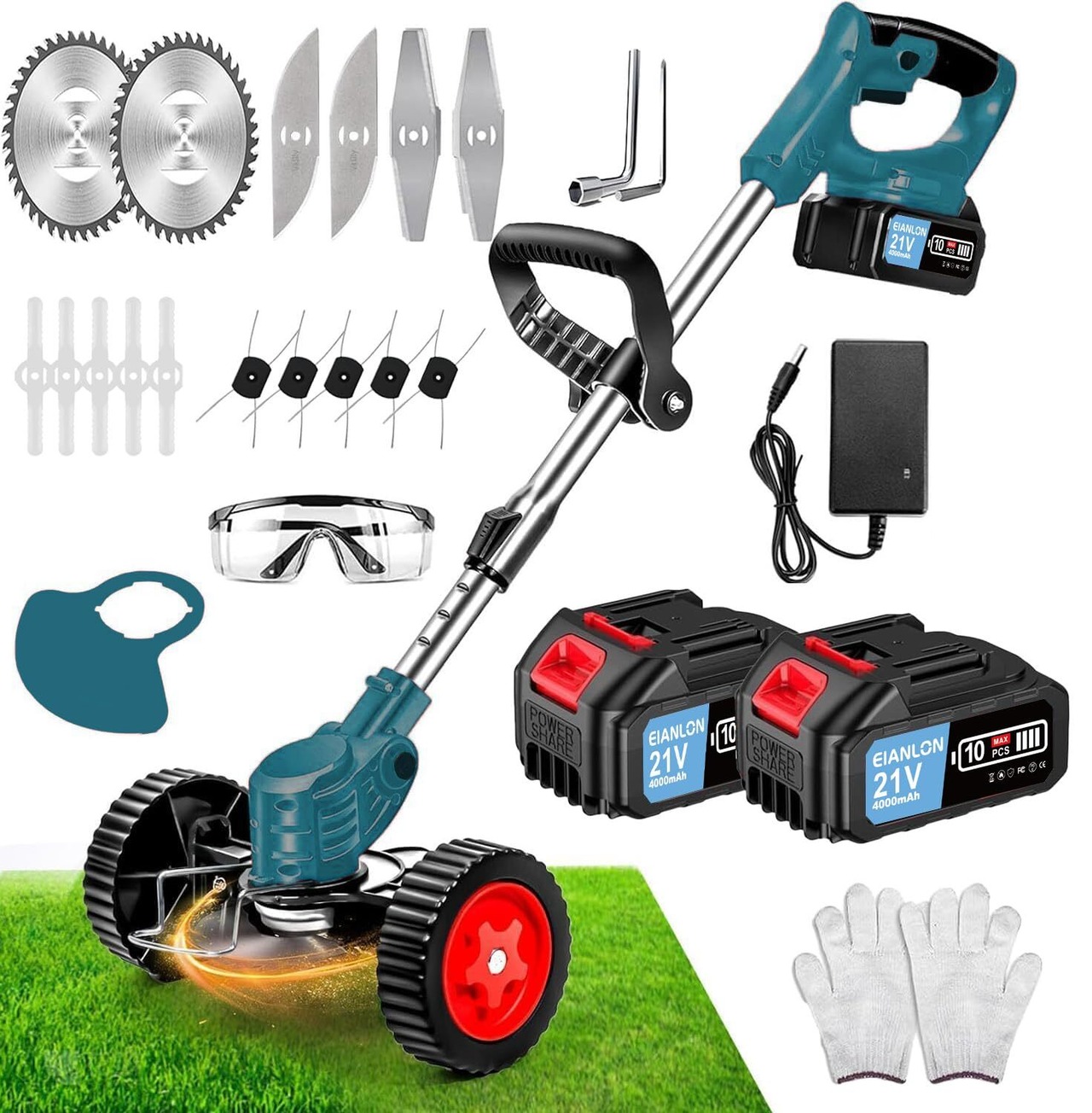 【2025強化版】草刈り機 充電式 EIANLON コードレス 芝刈り機 大容量21V/4000mAhバッテリー2個付属 軽量 電動草刈り機 マキタ対応18Vバッテリー互換 多地形 伸縮 角度調整 4種類の替刃で芝生 枝切り 畑 雑草 植木対応 家庭用 農業園芸用機器 日本語説明書(6インチ/青)