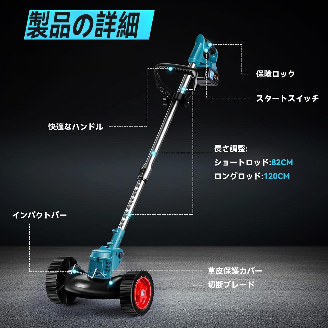 【軽量で使いやすい】コードレス雑草トリマーはわずか1.8KGで、ホイールが付いており、軽量で女性、子供、お年寄りでも使いやすいです。紐なし刈払機には調節可能な伸縮ポールがあり、長さを82〜120CMまで調整できます。かがむことなく、あらゆる身長の人に必要な長さを提供し、ヘッド角度は0〜90°で調整可能で、傾斜地や狭い場所でも、隅々まで楽にケアできます。