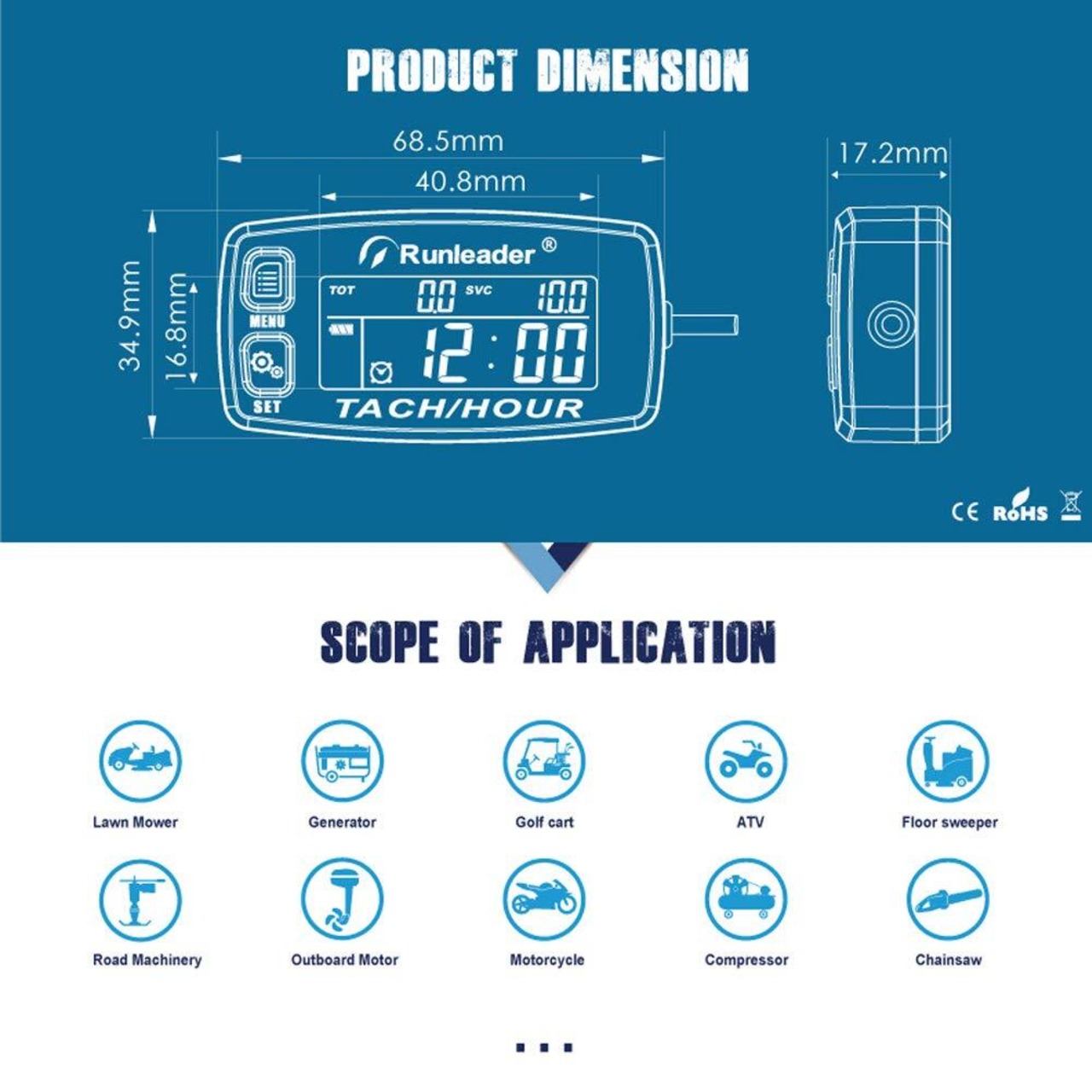 セルフパワーエンジンデジタルメンテナンスリマインダータコメーターには、タコメーター、アワーメーター、サービスタイマー、ジョブタイマー、プログラム可能なMAX RPMリマインダー、バックライトモードの選択が含まれています。交換可能なバッテリー、シャットダウン機能、防水設計