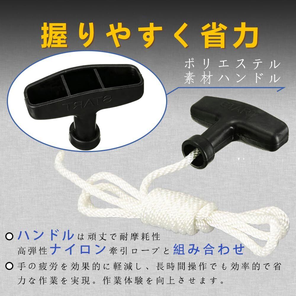 【高強度耐久素材、長持ちする耐摩耗性】ハンドルは頑丈で耐摩耗性に優れ、変形しにくい設計。高弾性ナイロン製牽引ロープと組み合わせ、高い引張強度と耐久性を実現。軽量性と耐久性を両立した設計で、頻繁な引っ張りにも耐え、工具の始動を確実にサポートします。