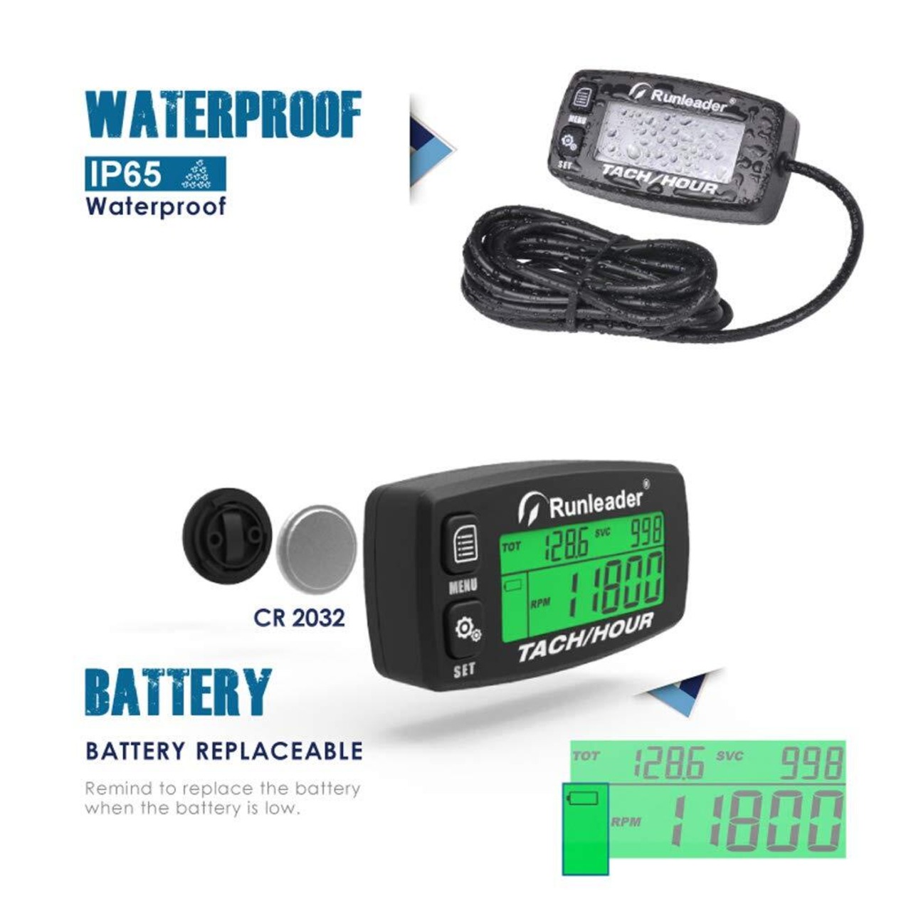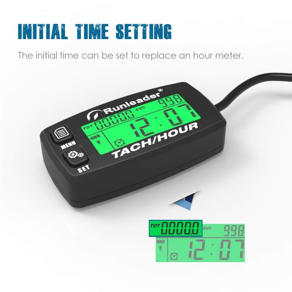 アワーメータータコメーター、メンテナンスリマインダー、アラートRPM、バックライト付きディスプレイ、初期時間設定可能、バッテリー交換可能、ZTR芝刈り機トラクター発電機用マリンATVおよびガス駆動機器 (黑 黑 黒い)