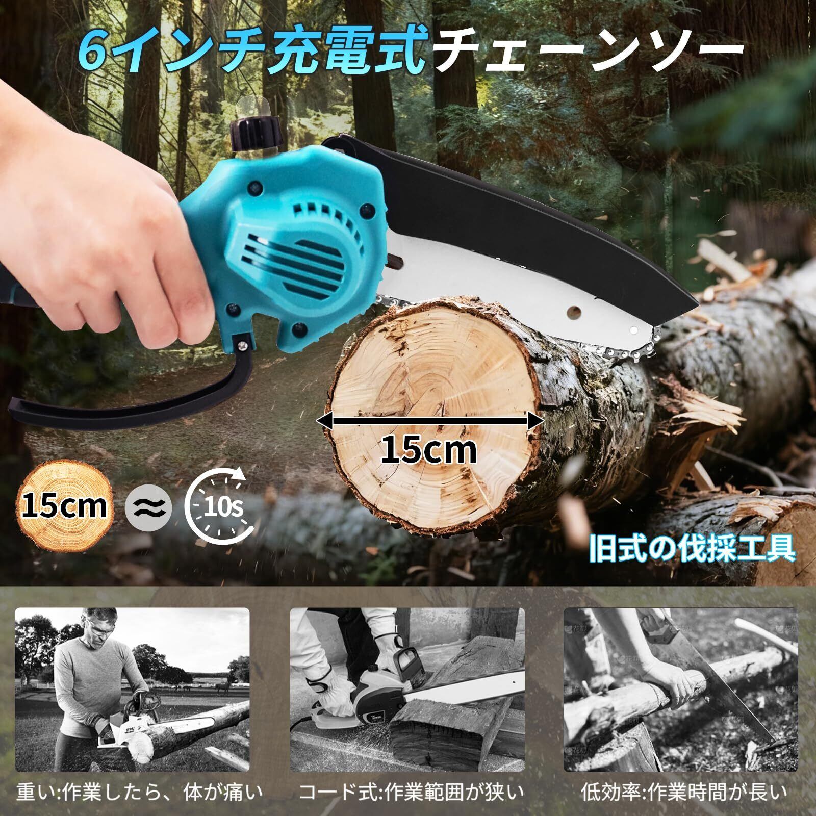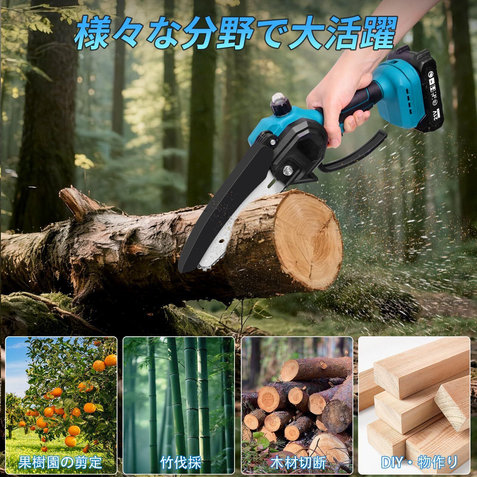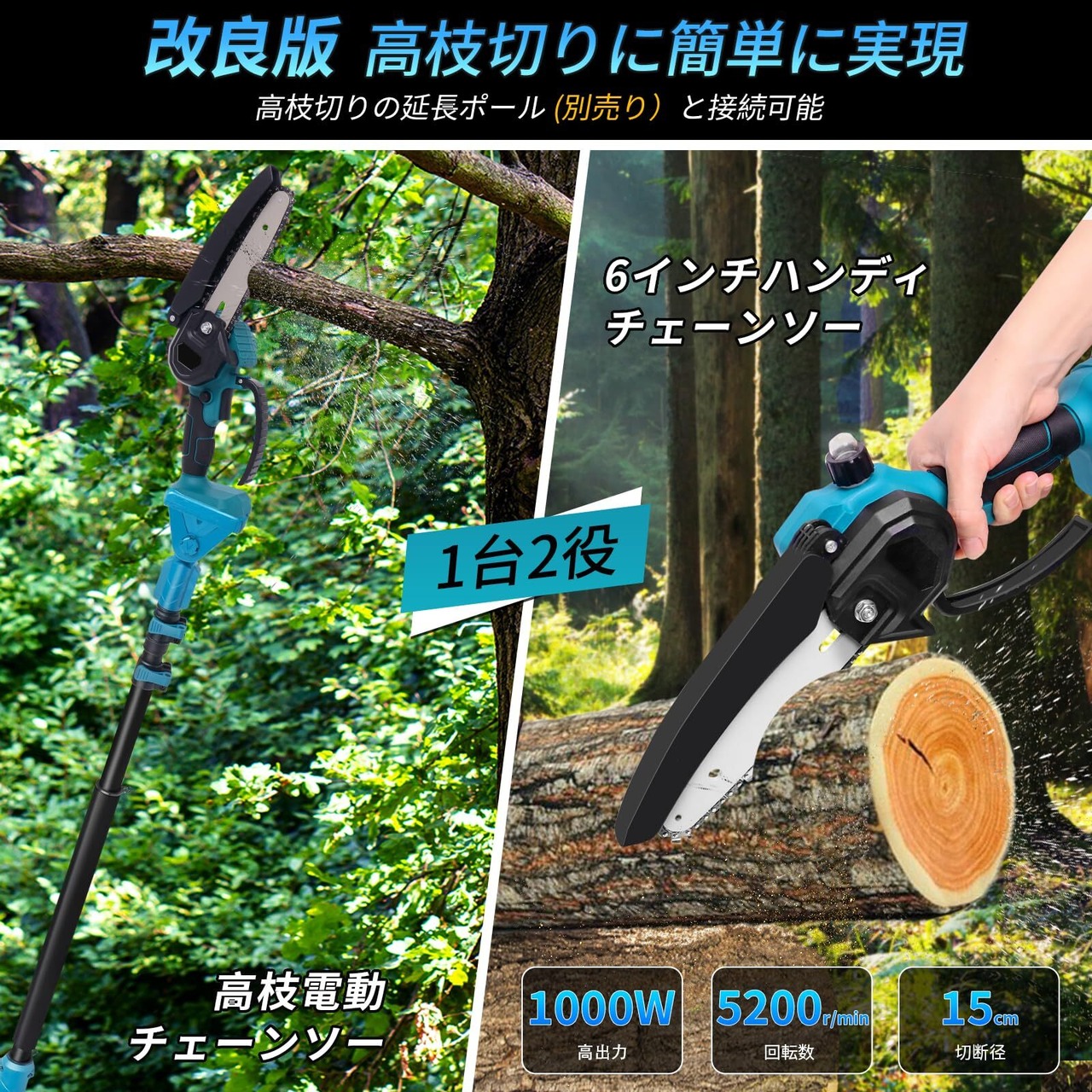 【2025最新】チェーンソー充電式【1本2役・6インチ高枝チェンソー・ハンディチェーンソー】ブラシレスモーター 2個2.0Ahバッテリー残量表示 自動給油 高枝切りの延長ポールと接続可能 電動式 軽量 強力 ミニ 小型 ハンド式 安全ロック コードレス 切断径15cm 竹・枝切り 庭木の剪定 薪作り 林業伐採 手袋 ゴーグル ボトル 替えソーチェーン ケース付き 日本語説明書 PSE認証済み