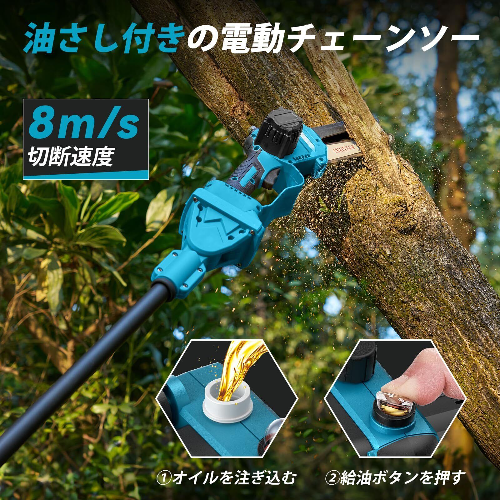 【コードレス・大容量バッテリー2個付属】SEESII M6G Proは電源コード不要の充電式タイプで、使用場所を選ばず自由に作業が可能。コードを誤って切ってしまう心配もなく、安全かつ快適にご使用いただけます。付属の2.0Ah大容量リチウムイオンバッテリー2個により、1本で約30分連続稼働が可能。予備バッテリーがあるため、長時間の作業でも電池切れを心配する必要がありません。️【高枝チェーンソーご使用時のご注意】❶ 必ず本体を起動してから、切断箇所にチェーンソーを接触させてください。❷ ご使用前にバッテリーをフル充電してください。❸ 使用中は無理に押し付けないでください。高枝ポールとチェーンソー本体の自重で十分です。過度な力を加えると、安全装置が作動し停止する場合があります。