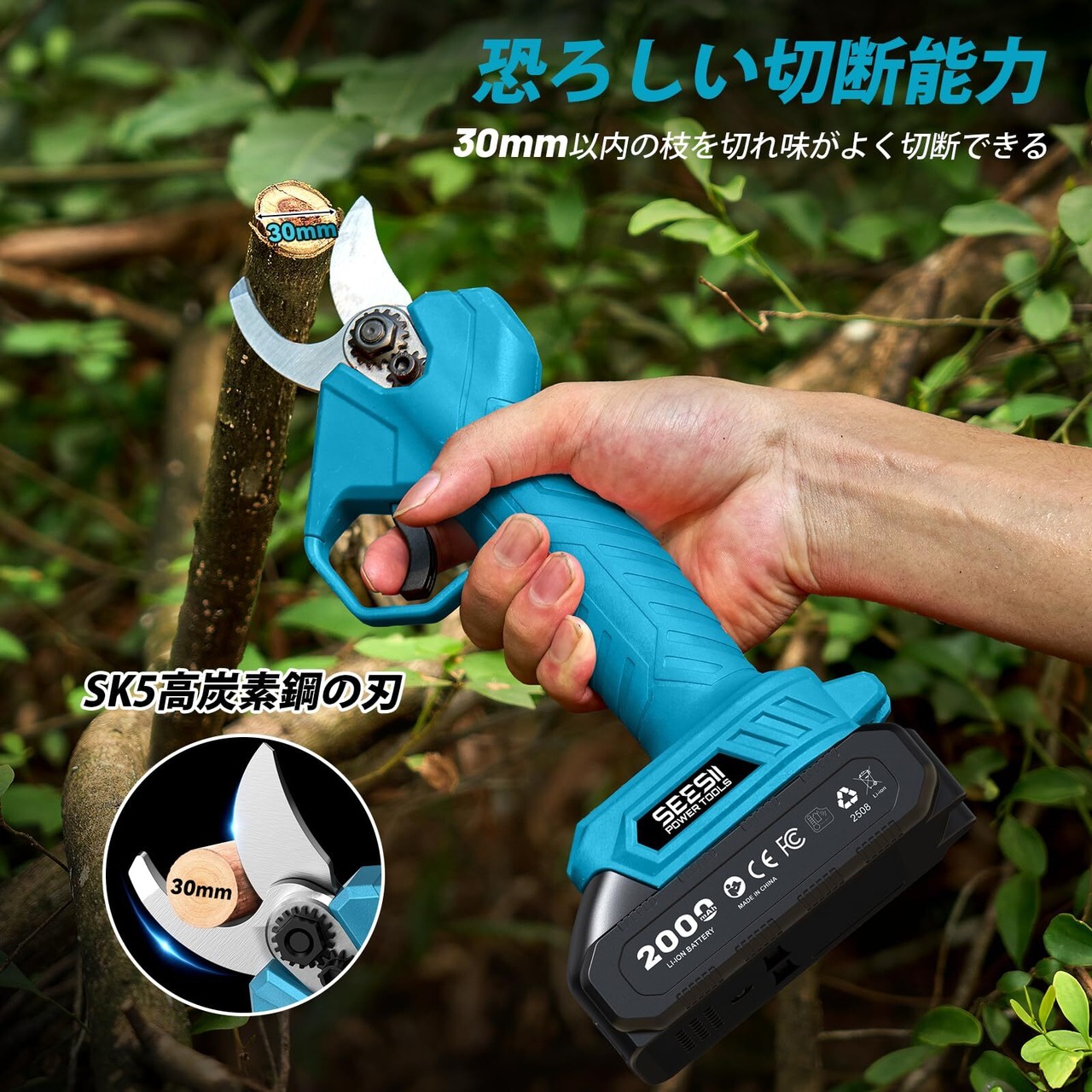 【高トルクでスムーズに切断!充電式電動剪定バサミ】SEESIIの電動剪定バサミは、開口幅最大30mmの広いカッティングレンジを備え、高品質モーターにより最大30mmまでの枝をスムーズかつダメージなく切断可能です。関節炎でお悩みの方や握力が弱い方でも簡単に操作でき、長時間の作業でも疲れにくい設計となっています。初期起動時は最大30mmで作動し、電源ボタンを押すことで20mmモードに切り替えることが可能。状況に応じて効率的な剪定が行えます。※ご注意:引き金と電源ボタンは同時に押さないでください。
