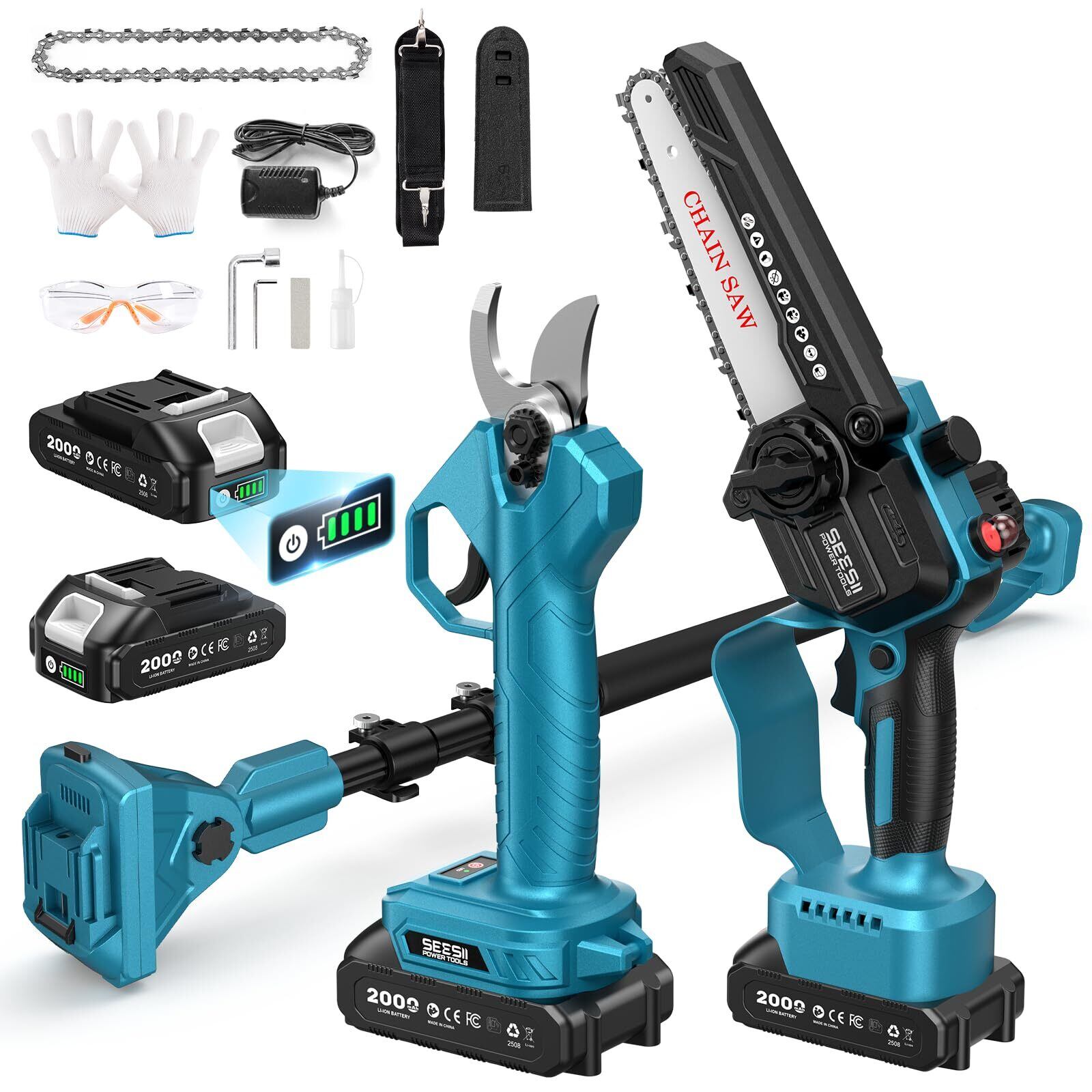 SEESII 高枝チェーンソー 電動 6インチ コードレス 充電式 チェーンソーセット 剪定バサミ付き 一台四役 無段階伸縮ポール(125〜250cm) オイルボトル搭載 軽量・パワフル 園芸・木工用 バッテリー2個 替刃・日本語取扱説明書付属(青い)M6G Pro