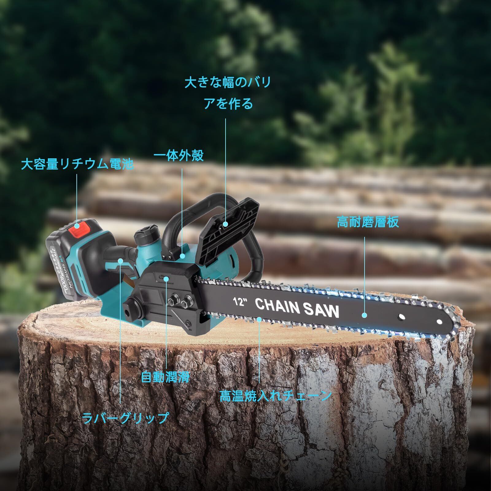 【パッケージ内容】チェーンソー電動 到着後すぐに使用可能で、取り付けは不要です。このチェーンソーには、バッテリー2個、12インチチェーン2本、充電器、レンチ、日本語取扱説明書が付属しています。