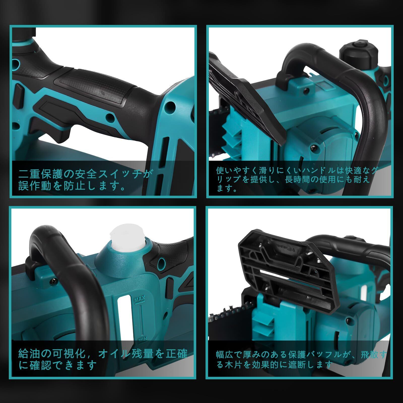 【多数保護機能 】1. 安全ロックが誤作動を防止(始動するには、安全ロックと始動ボタンを同時に押す必要があります)。2. 安全ガードが木材の飛散を防止。3. 滑り止め加工のハンドルでしっかりと握れます。安全で信頼性が高く、安心してお使いいただけます。4. 工具不要の張力調整で、チェーンの緩みや脱落を防止。
