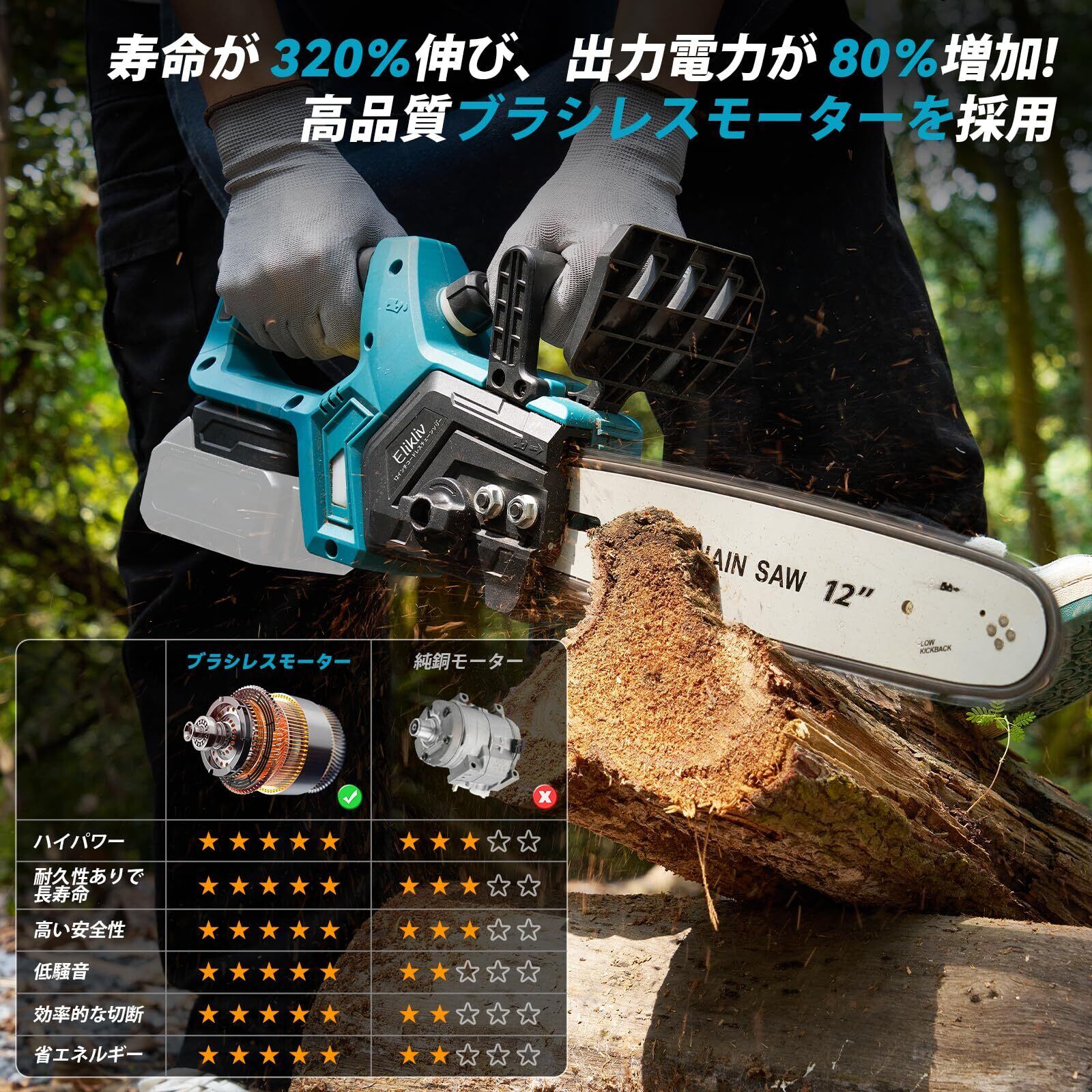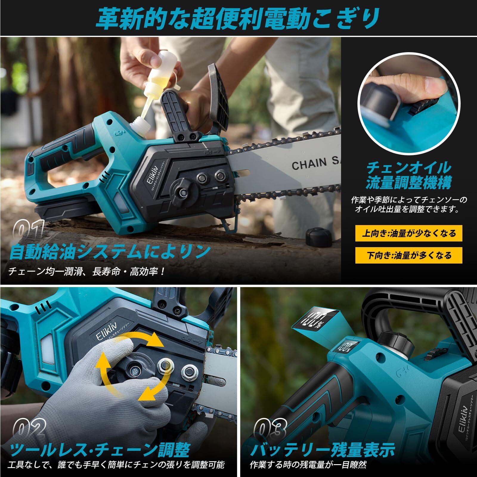 【2025新型】Elikliv 12インチ 電動チェーンソー 充電式 切断径 350mm ブラシレスモーター 自動給油 ツールレス・チェーン調節 残量表示可能 ガーデニング 家庭用 木工切断 大工道具 園芸設備 伐採 薪作り 18Vバッテリー対応 BL1830 BL1840 BL1850 BL1860 替刃1 本 収納ケース 日本語取扱説明書付き 本体のみ バッテリー別売り