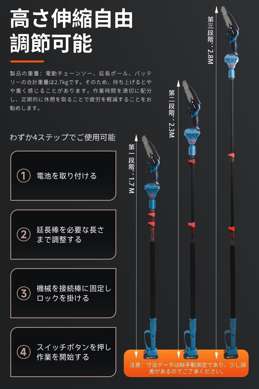 【パッケージ内容とご注意事項】:[パッケージ内容] 1 x 電動チェーンソー、1 x 伸縮延長ポール、2 x大容量バッテリー、1 x 充電器、1 x 取扱説明書、1 x 安全眼鏡、1 x 予備のチェーン、2 x ドライバー、1 x 作業用手袋。電池の過放電を防ぐため、少なくとも月に1回は電池を充電してください。製品に初期の欠陥があるか、通常の使用中に故障が発生した場合は、販売業者にご連絡ください。お問い合わせは24時間以内に返信されます。【お問い合わせ方法】:「アカウントサービス」にアクセスし、[アカウントサービス]→[注文履歴]→[注文番号]→[販売者]→[質問をする]。