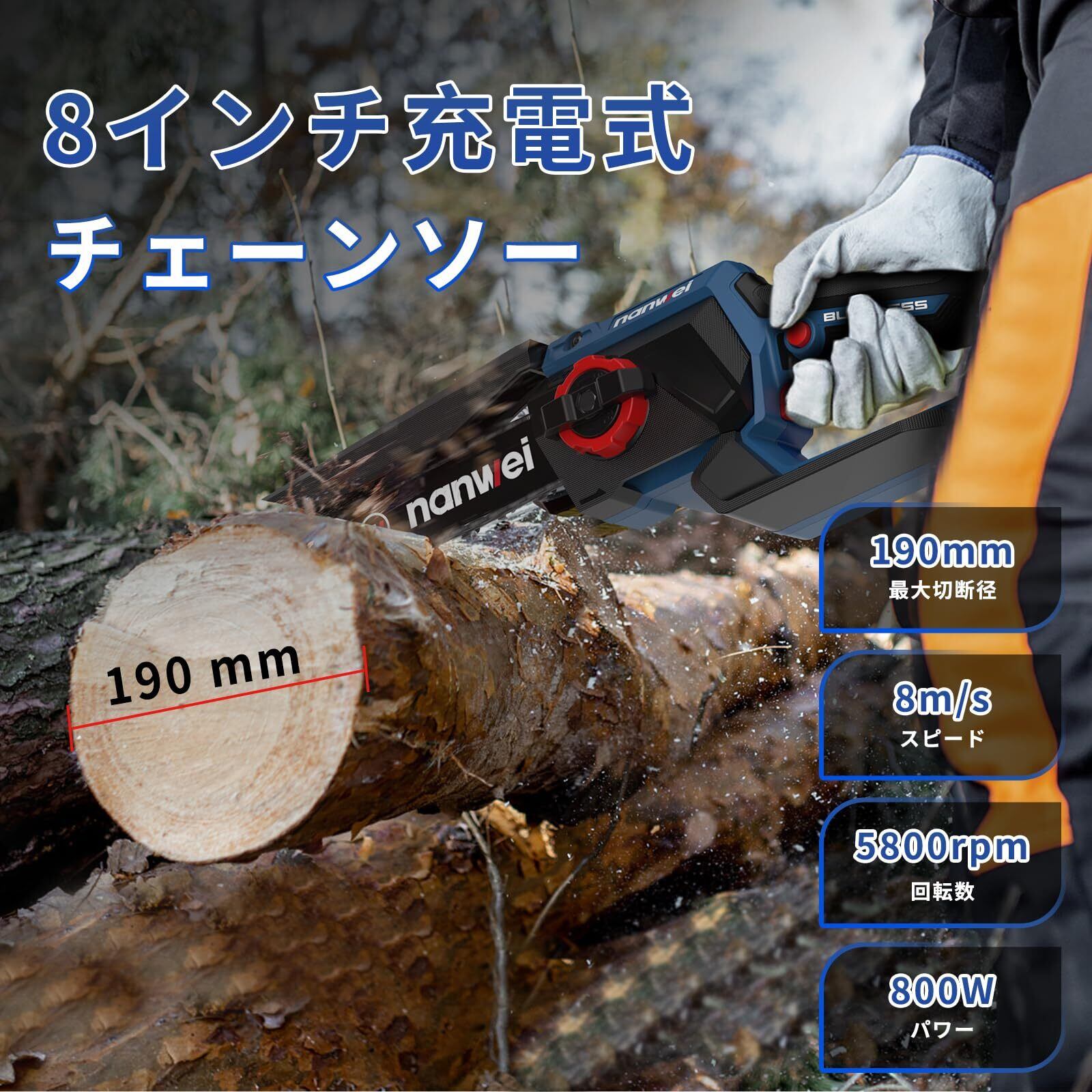 NANWEI チェーンソー充電式 8インチ マキタ18Vバッテリー対応 工具レス調整 電動チェーンソー ブラシレスモーター 電動のこぎり 6インチ小型 軽量 伐採・枝払い・枝打ち・薪作り・庭木の剪定 【バッテリー・充電器別売り】