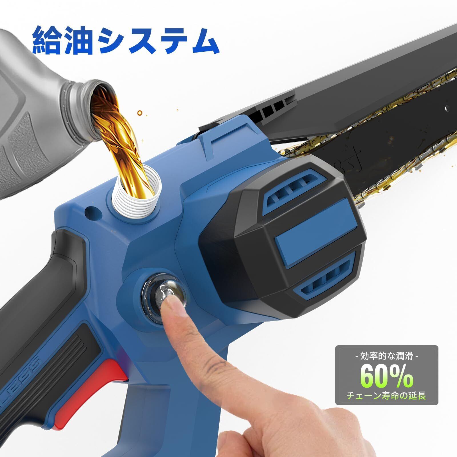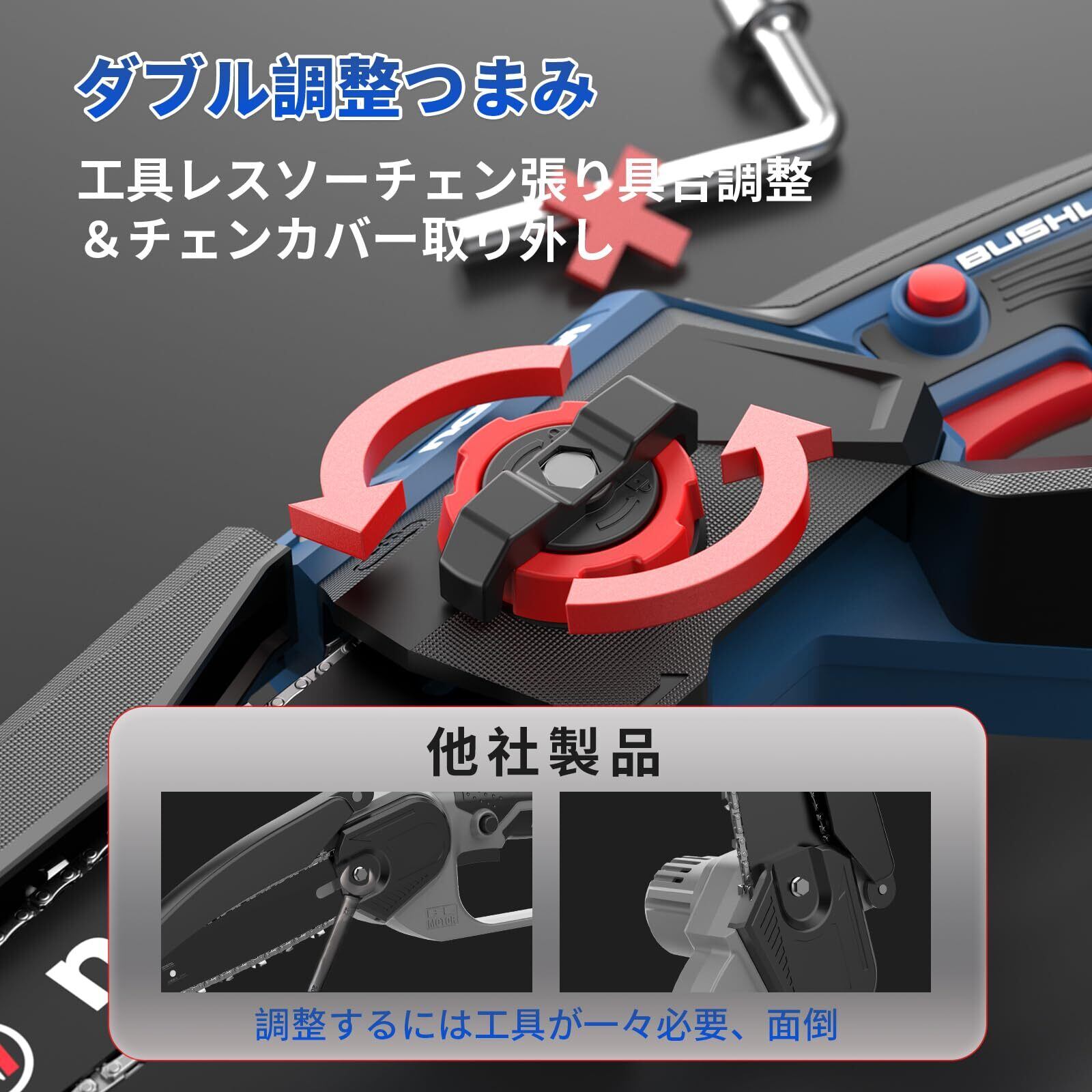 【給油システム&工具レス調整】この充電式チェーンソーには給油システムが装備されています。給油タンクにオイルを注ぐだけで、必要な時にポンプを軽く押すとチェーンに給油できます。またミニチェーンソーはソーチェンの張り具合調整とカバー取り外して中の掃除をする時、他の工具が要らず本機のつまみを回すだけ、迅速なおかつ気楽で高効率性が実現します。