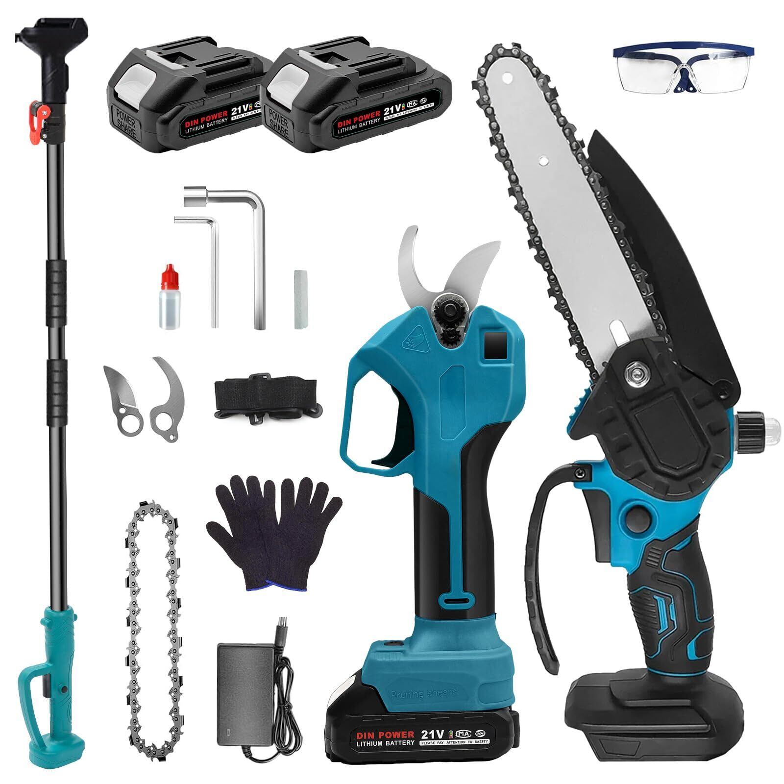【高品質なアクセサリーセット】この高性能の高枝切り電動チェーンソーは、お客様が求める高いレベルのディテールと品質を考慮し、これらには、伸縮术一儿x1、電動チエ一ンソ一x1、電動剪定ばさみx1、保護メガネx1、予備のチエ一ンx1、安全ベルトx1、インスト一ルツ一ル(油は含まれていません)、替刃x1、2000mAhパッテリ一x2、充電器x1、手袋x1、取扱說明書が含まれます。