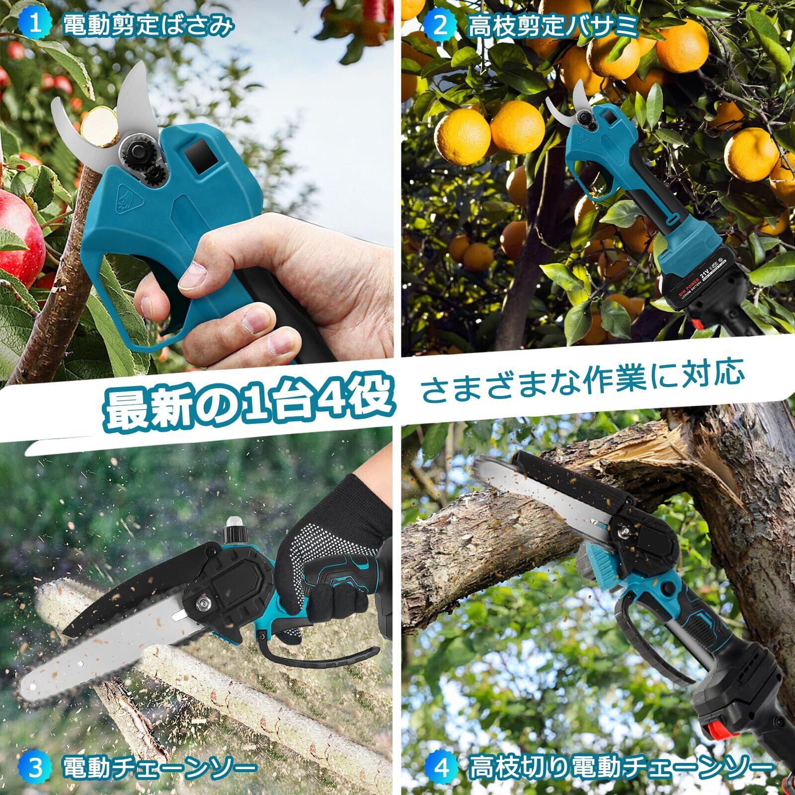 【2025年新モデル】高枝チェーンソー 充電式 電動チェーンソー 高枝電動バサミ 剪定バサミ 電動 高枝切りバサミ 1台4役セット最長1.7m 着脱式伸縮延長ポール 21V 2000mAh大容量バッテリー2個 6インチ チェーンソー 充電式 手入れ 高枝のこぎり 剪定はさみ 強力 木プロ伐採 園芸 木工切断 庭木の剪定 日本語取扱説明書付き