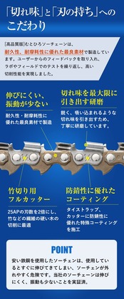 竹切りに最適なソーチェーンです。カッター刃の数を2倍に増やすことで竹のような繊維の硬い木でも切断スピードが落ちません。