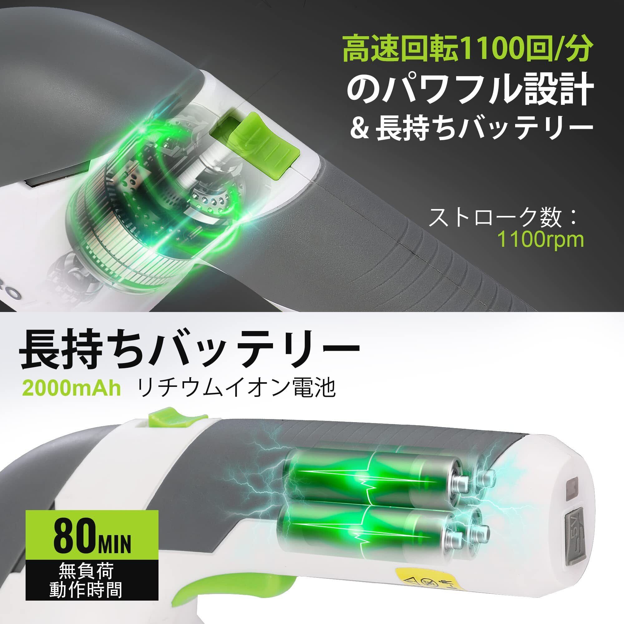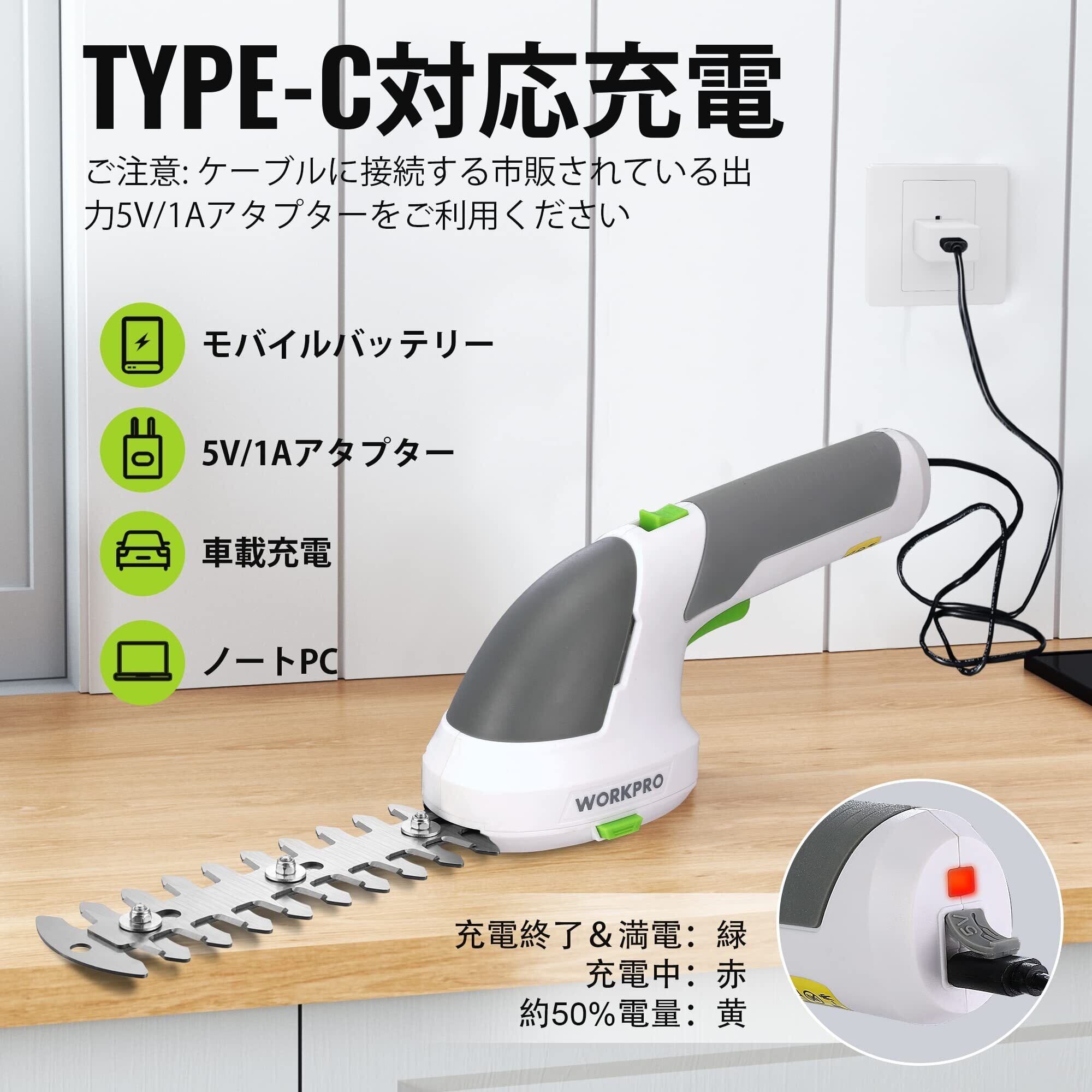 【効率向上7.2V充電式】7.2 V強力バッテリに全新進化、無負荷運転時間80分使用可能になります。コードレスタイプなので、コードが絡まったりひっかかる心配もなく、様々な場所で使用できます。USBケーブル(Type-C充電ポート)が付いて、ノートPC、車載充電などに対応充電できます。それに、普通の市販されているアタプター(5V/1A)にも接続して、充電ができるので便利です。フル充電の時間は約2-3時間です。充電が完了するとインジケーターライトが緑色に点灯します。ストローク数は一分1100回、剪定の効率が向上になります。ご注意:USBケーブルに接続する市販されている出力5V/2Aアタプターをご利用してくださいませ、(アダプター出力5V/1A)足りない場合、充電ができなくなります。出力電圧が過電圧保護動作値(アダプター出力5V/1A)を超えた際に、過電圧保護回路が動作し、出力を停止させ、充電ができなくなります。
