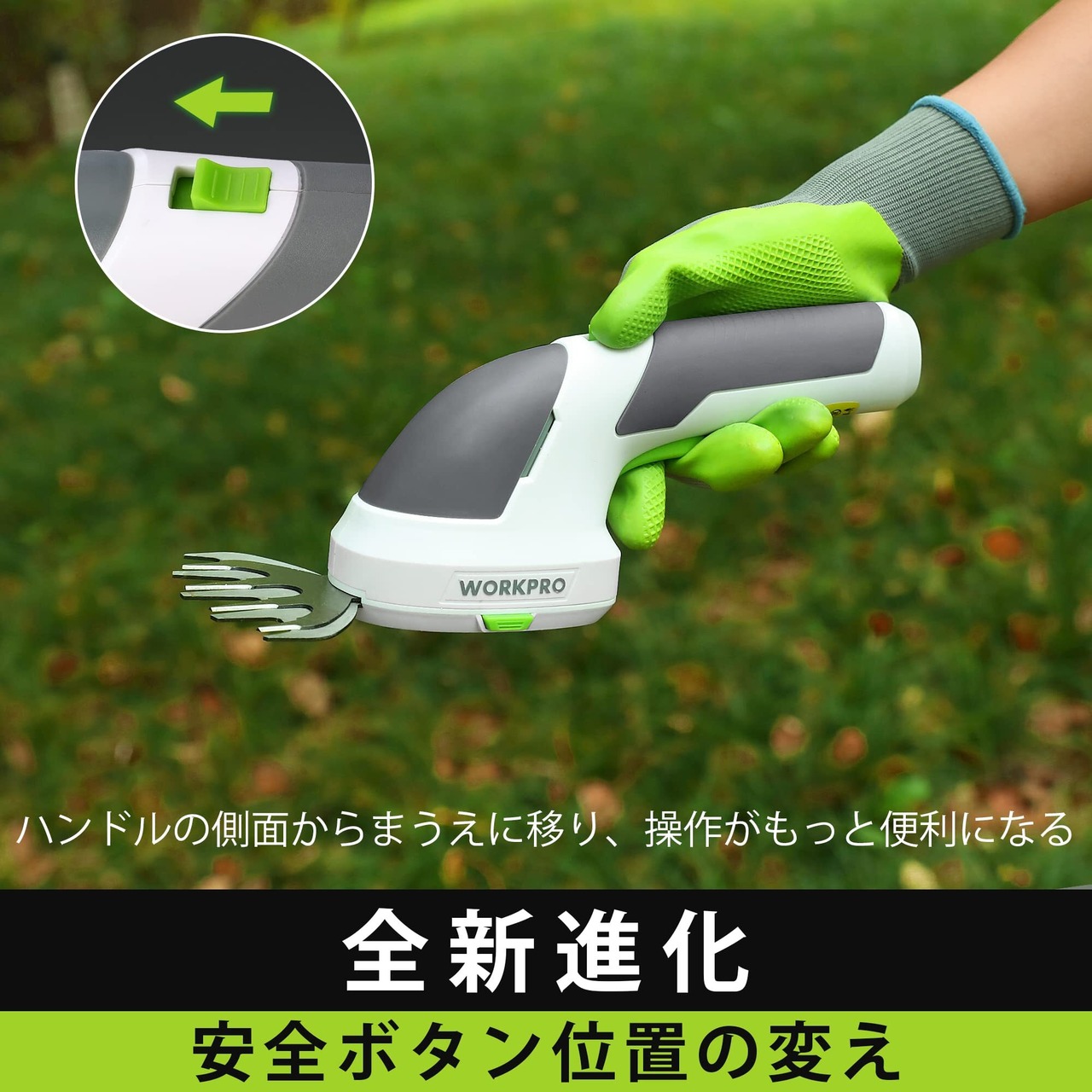 【2025新進化・安全ボタン位置の変え】安全ボタンをハンドルの側面からまうえに移り、操作がもっと便利になります。ハンドルのまうえに安全ボタンと運転スイッチを同時に押すると運転できます。また、運転してからセキュリティボタンを放したままで作業が続けます。