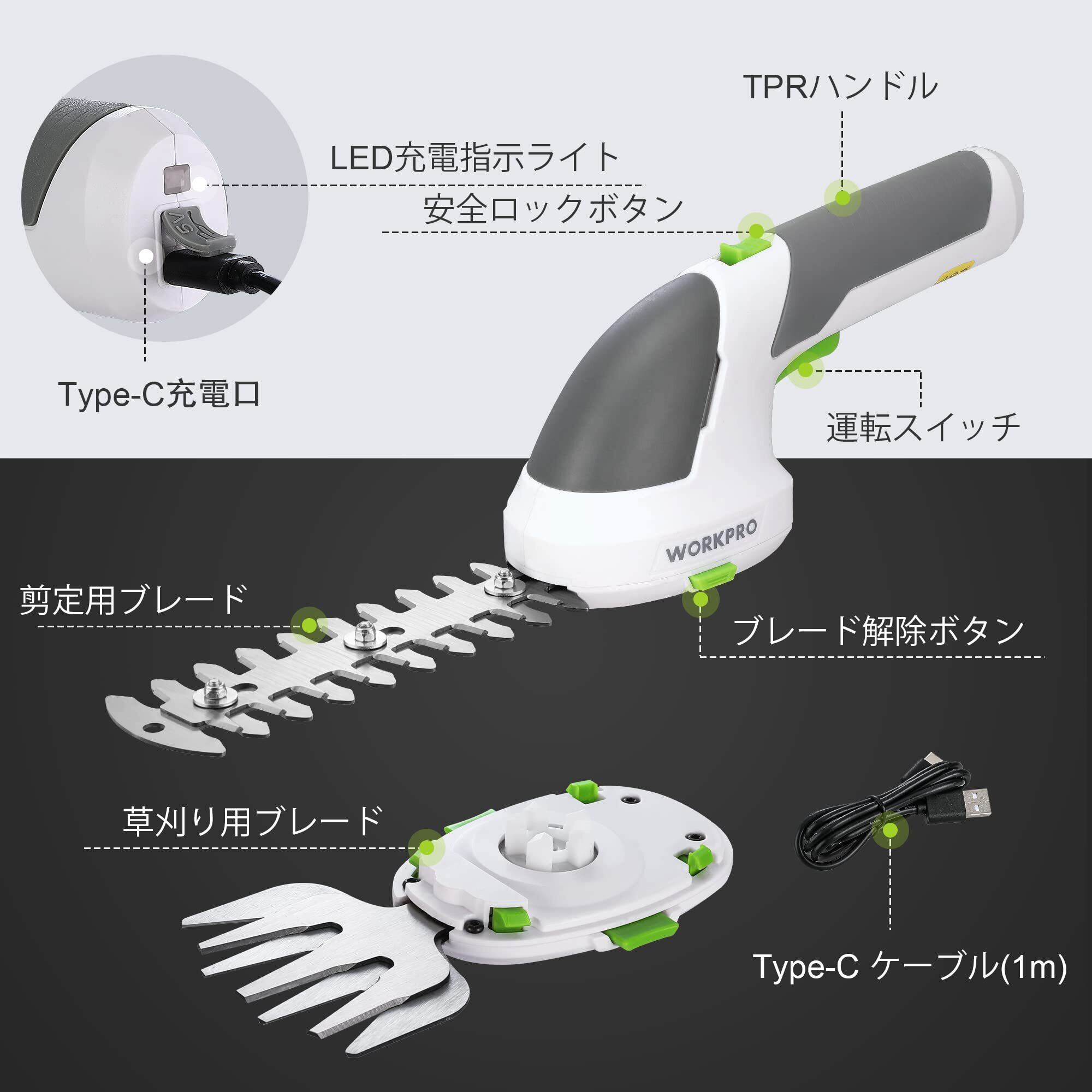 【特別価格】[安全ボタン進化]WORKPRO 芝生バリカン ガーデンバリカン 生垣バリカン 芝刈り機 一台二役 コードレス 7.2V充電式 二重安全ロック ブレード2枚付 バリカン刈幅100mm トリマー刈幅150mm 剪定 植木 園芸 W159034