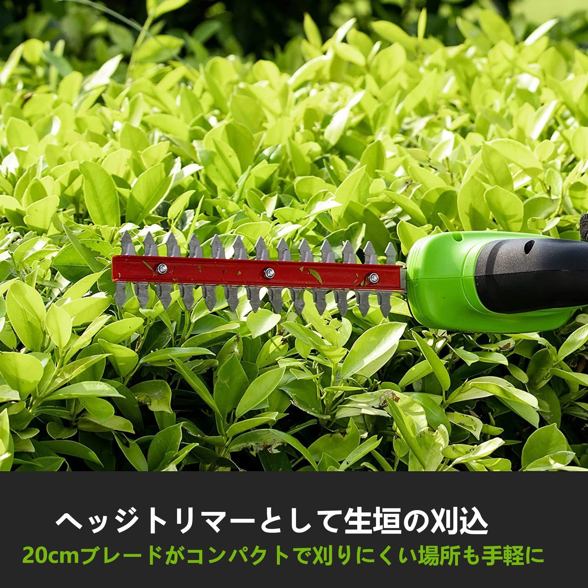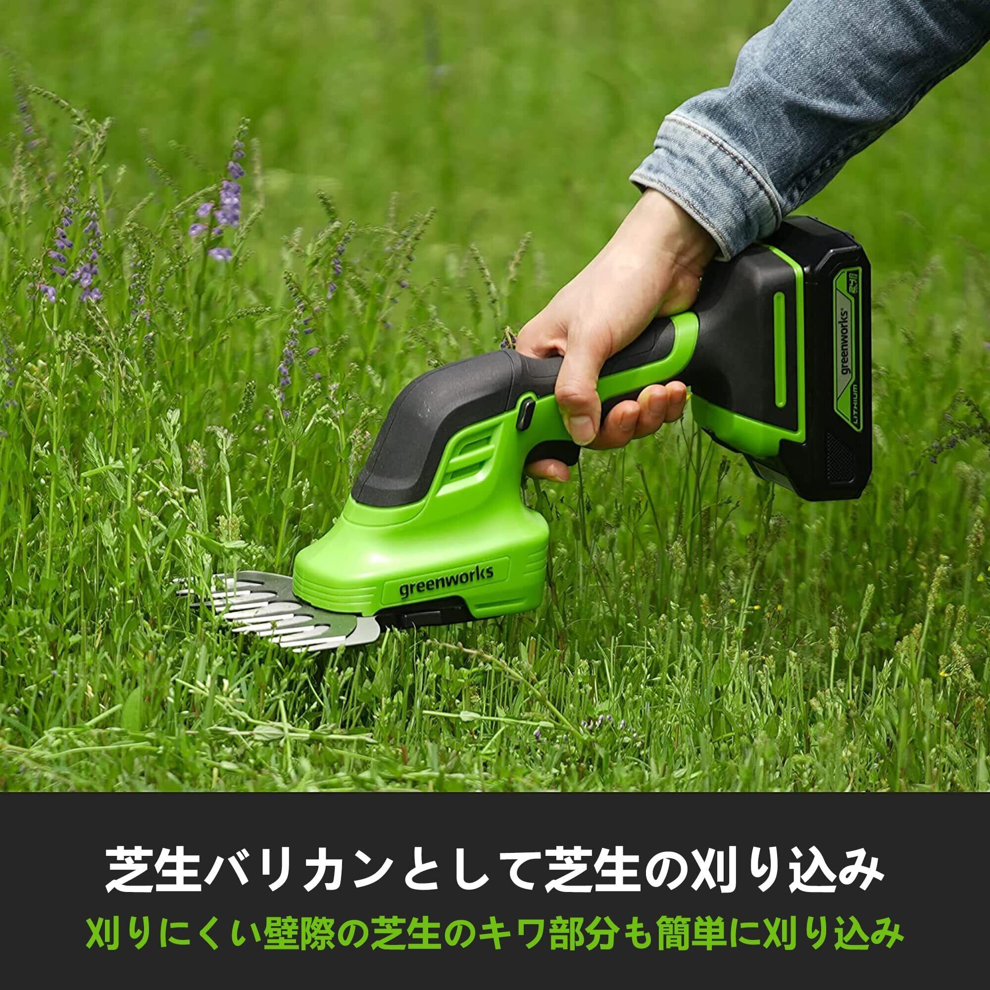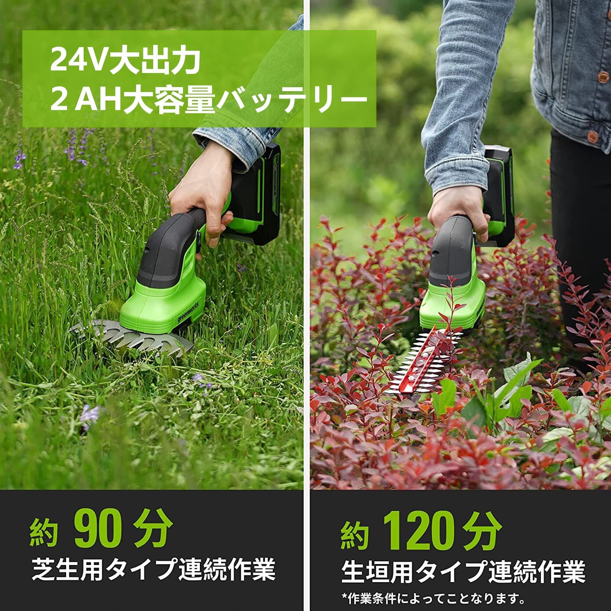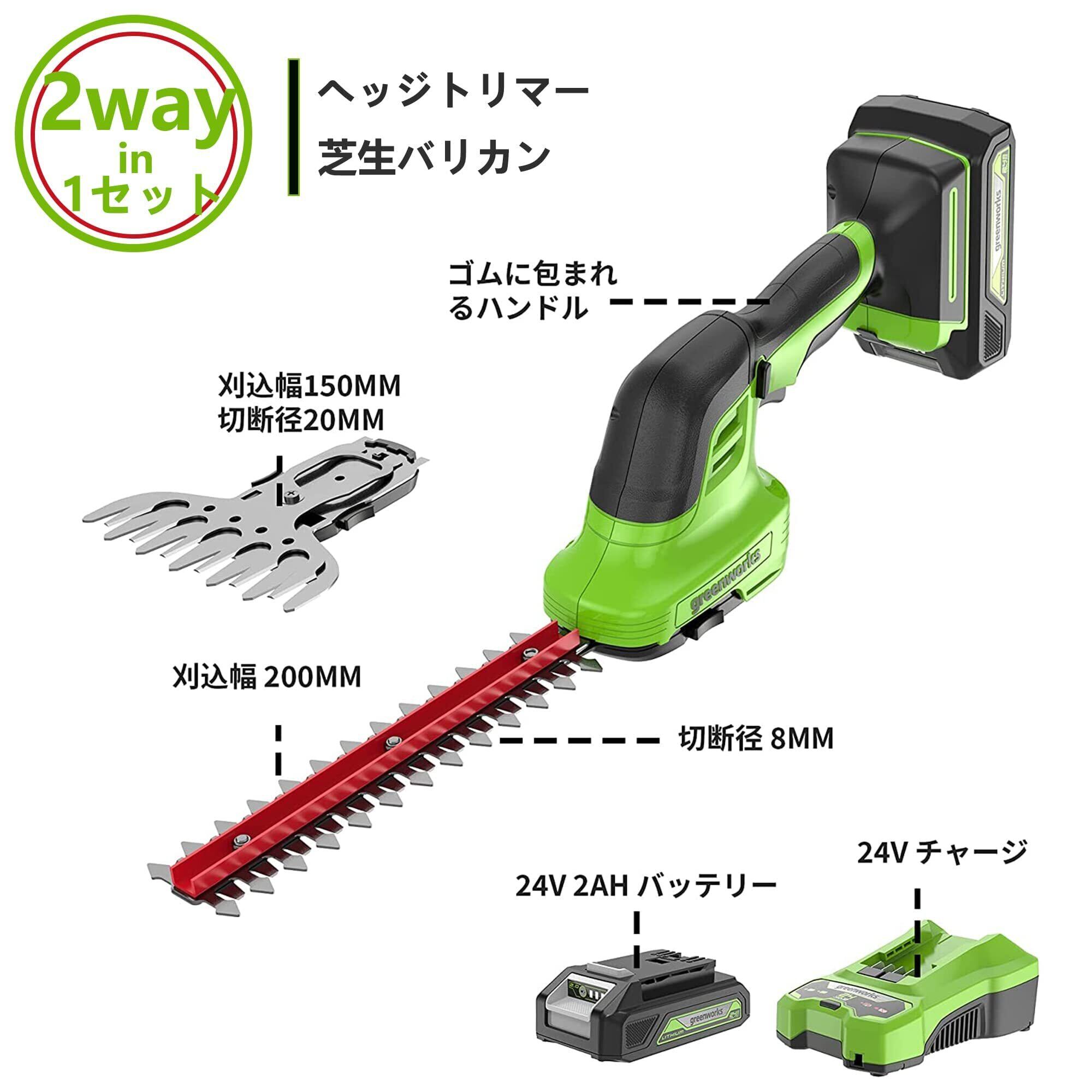 【新着商品】Greenworks(グリーンワークス) 充電式電動芝生バリカン グリーン バリカン刈幅150mm 切断径20mm 24V 2Ah USBバッテリー・充電器付属 1台2役の草刈り用バリカンブレードと植木剪定用トリマーブレード切り替え可能型 生垣 剪定 枝切り 【日本正規輸入品】 HTG301