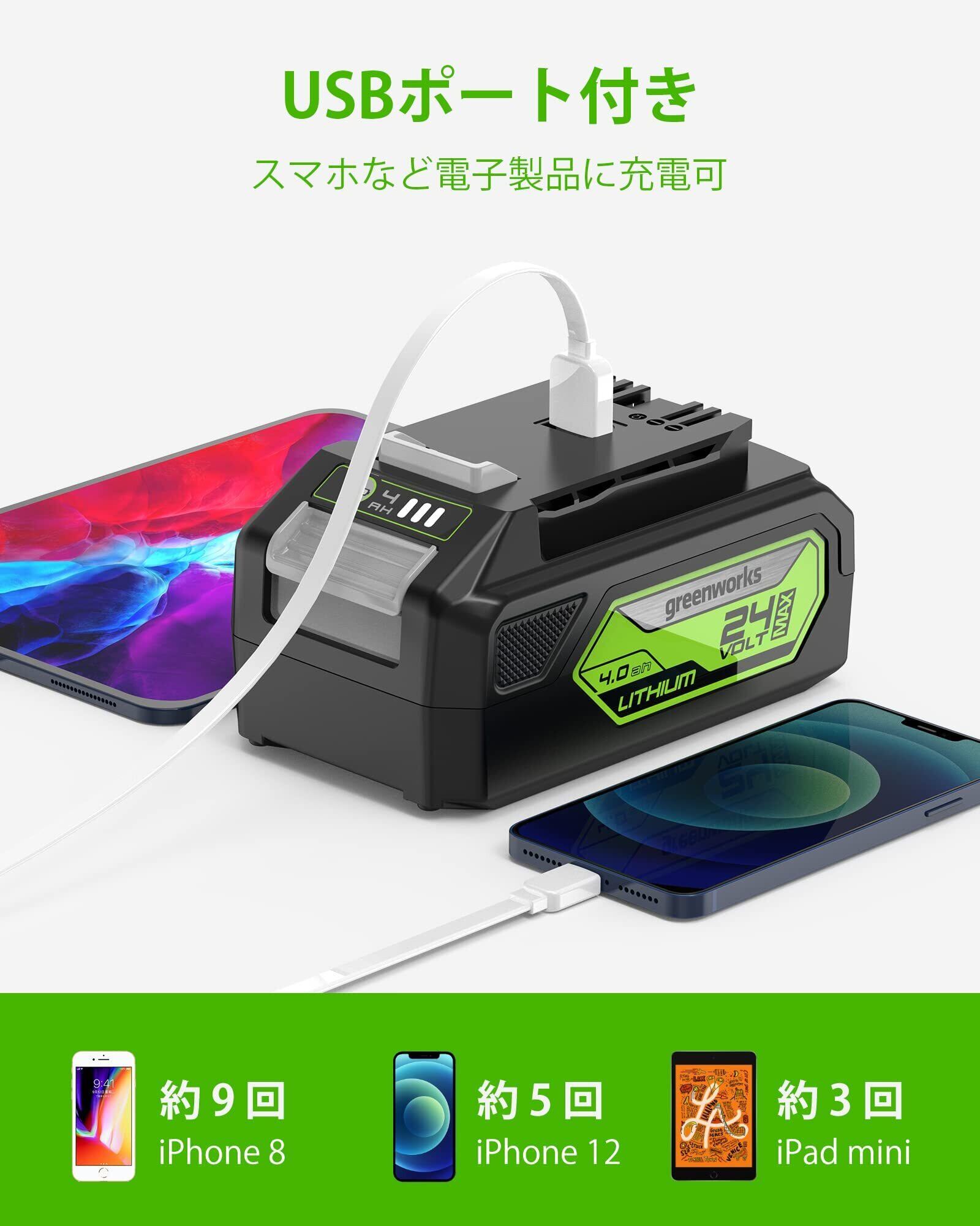 グリーンワークスの24Vリチウムイオンプラットフォームは、芝刈り機、ブロワー、ストリング・トリマー、チェーンソー、パワーツールなど、50種類以上の屋内外の製品を駆動させる。24Vリチウムイオンバッテリーは、出力が20%、ランタイムが35%向上し、充電後のメモリー切れを起こさないフェードフリーのパワーに優れている。屋外用パワー機器では、2Ah、4Ahのバッテリーを使用して、1/4エーカーまで取り組むことができる。また、「BAG708」「BAG709」のバッテリーにはUSBポートが搭載されており、スマホやタブレットなどの電子機器のポータブル充電器として利用できる。