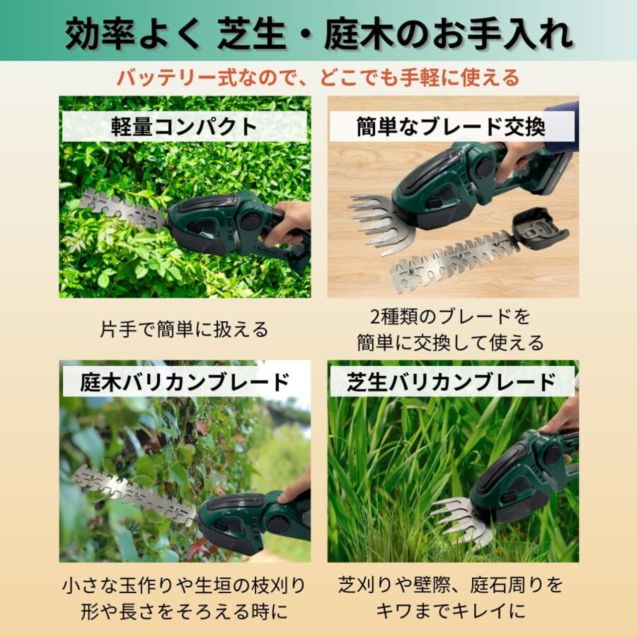 2種類の刃が付属するので芝生バリカンだけではなくヘッジトリマーとしてもお使いいただけます。