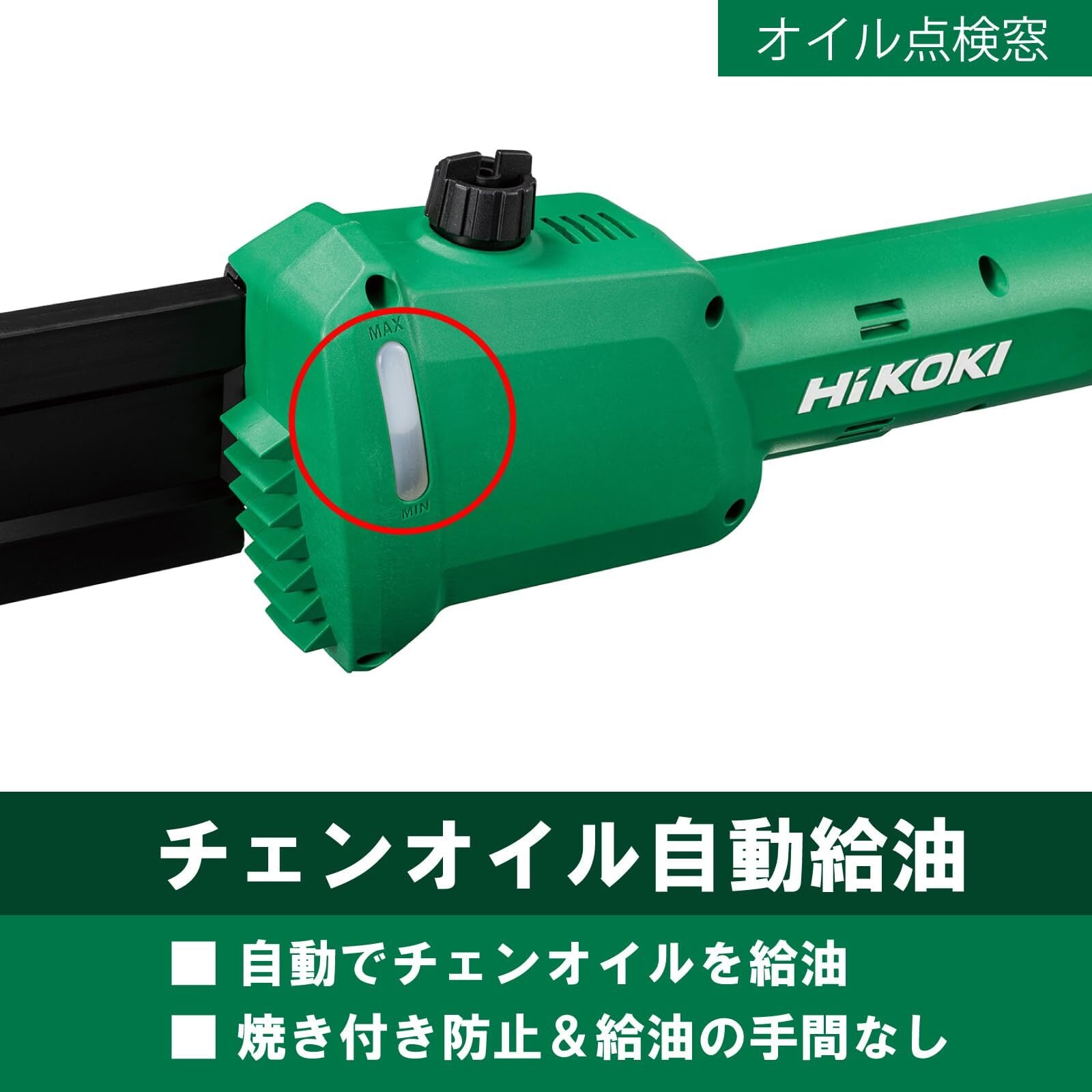 安全に配慮したロックオフボタンやチェーンオイル自動給油機能がついています。ソーチェンの交換や張り調整もツールレスで行えます。