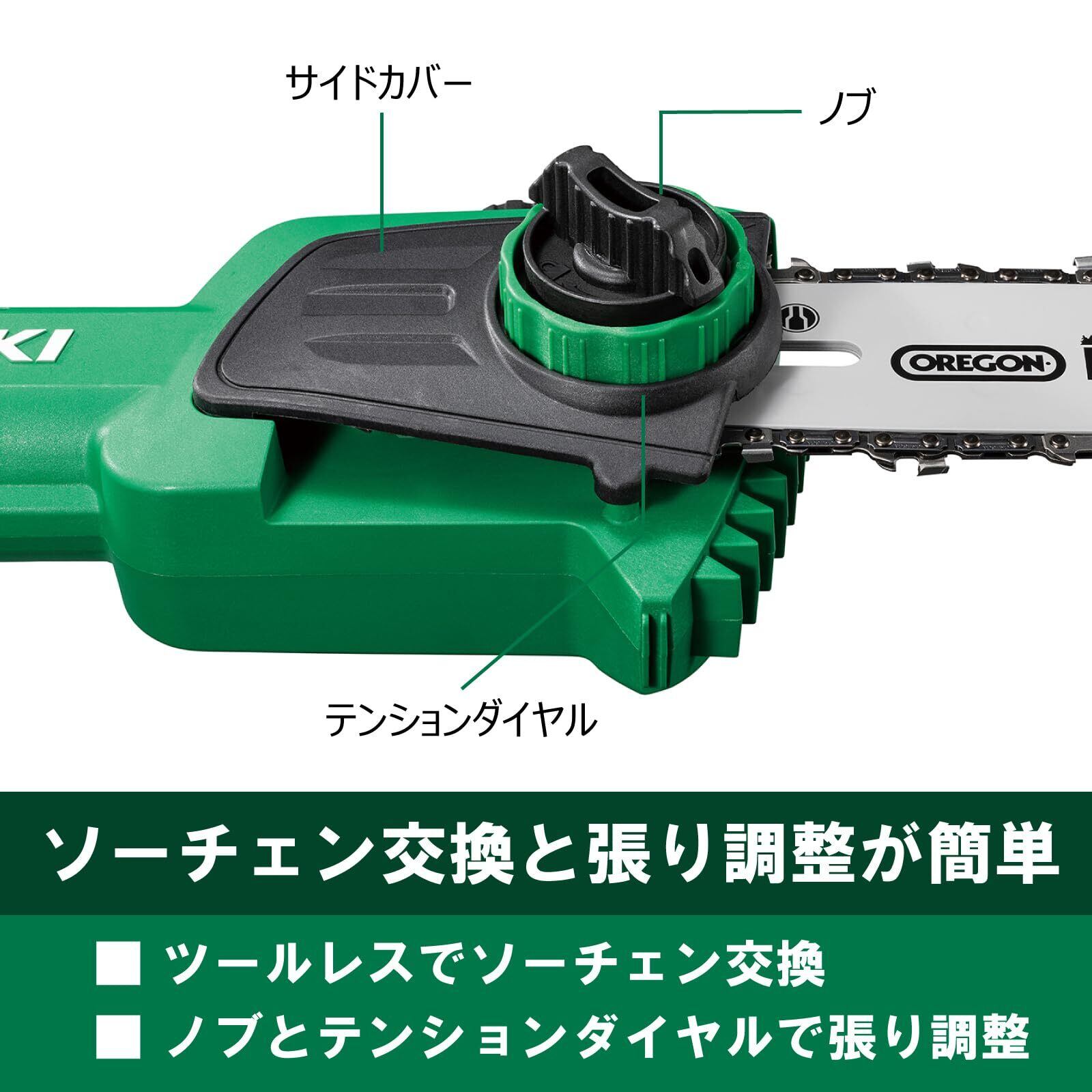 ノブを緩めるだけでサイドカバーの取り外しができ、ノブとテンションダイヤルでソーチェンの張り調整が行えます。