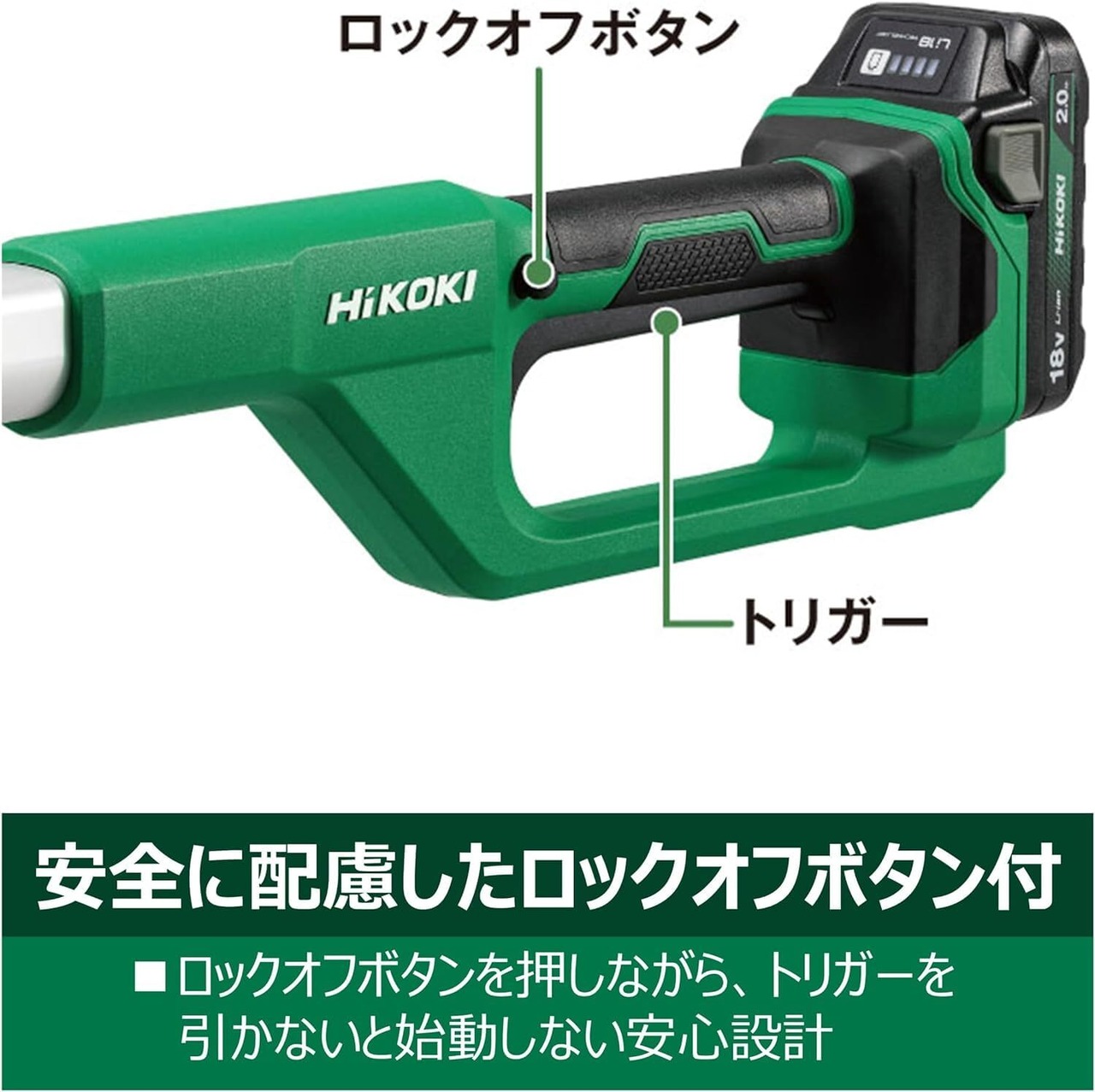 ロックオフボタンを押しながらトリガーを引かないと始動しない安心設計。不意の事故を防止します。