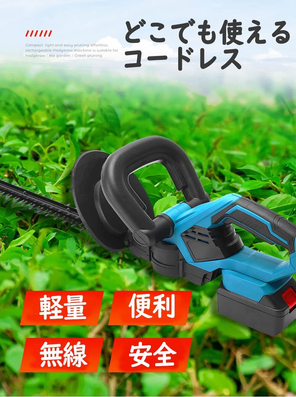 【軽量&コードレスヘッジトリマー】とこでも手軽に使える軽量&コードレス植木トリマー。軽量約2.84KG。長時間の使用でも疲れにくく、持ち運びもしやすいです。取り回しが良いコードレス園芸トリマーで、電源がない場所でも使用可能です。