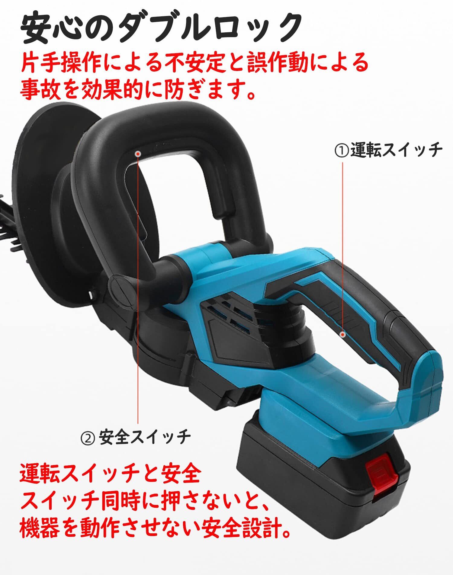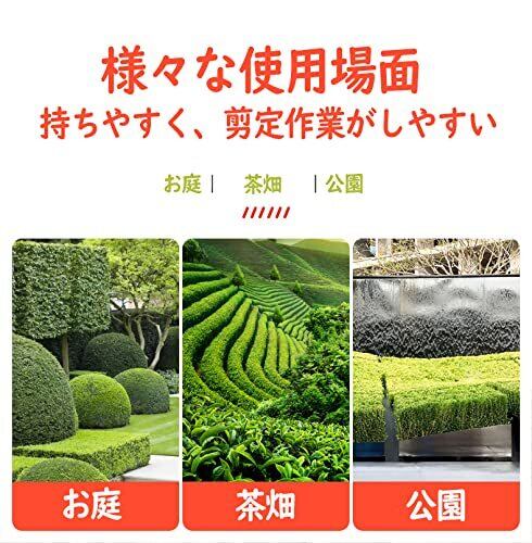 【握りやすいハンドル形状&ハイパワー&刈込高作業率】しっかり持てるU字型ハンドル。手にフィットし、腕の負担を軽減でき、作業はとても快適です。ヘッジトリマーに搭載した純銅製高出力・高耐久モーターが強いパワーを提供し、最大ストローク数1500min-1 を実現。お庭、茶畑、公園、低木での剪定作業などに適用できます。ヘッジトリマーの低木最大切断径:直径約20mmです。