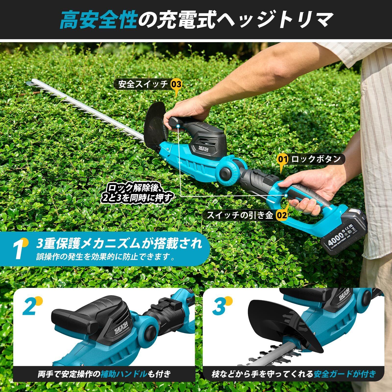 【高安全性の SEESII 充電式ヘッジトリマー】誤操作防止を最優先とし、3 重保護メカニズムを搭載:①ロックボタンを解除した上で、②スイッチの引き金と③安全スイッチを同時に押さなければ作動しない設計となっています。これにより不用意な起動を完全に防ぎ、家庭での使用にも十分安心できます。 さらに、両手で安定して操作できる補助ハンドルを付属。作業中の機器のグラつきを抑制して操作精度を高めると同時に、腕への負担も大幅に軽減します。加えて、枝の跳ね返りや意図しない接触から手を守る安全ガードも装着しており、剪定作業時の手元安全を万全に保ちます。