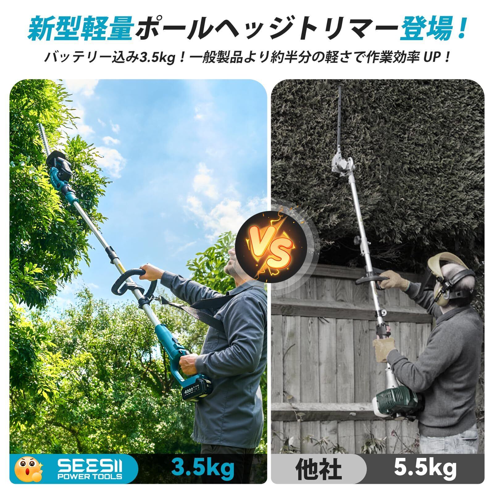 ️【1 台 2 役・SEESII 新型軽量ポールヘッジトリマー登場!】ポールは取り外し可能で、「1 台 2 役」を実現:ポール装着時は高所や奥行きのある生垣を楽々剪定でき、取り外せば充電式ヘッジトリマーとして使用できるため、全方位の剪定ニーズに応えられます。さらに、バッテリー込みでわずか 3.5kg(一般製品の半分以下)と軽量で、加えてポールに付属する補助ハンドルと肩掛けベルトにより、長時間作業しても肩や腕への負担を大幅に軽減できます。この軽量化设计で作業効率もアップし、園芸愛好家にとって理想的な新しいパートナーと言えるでしょう!