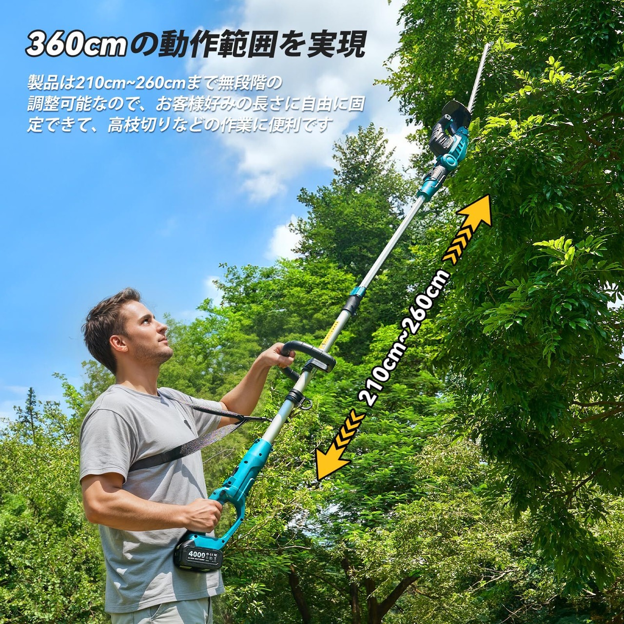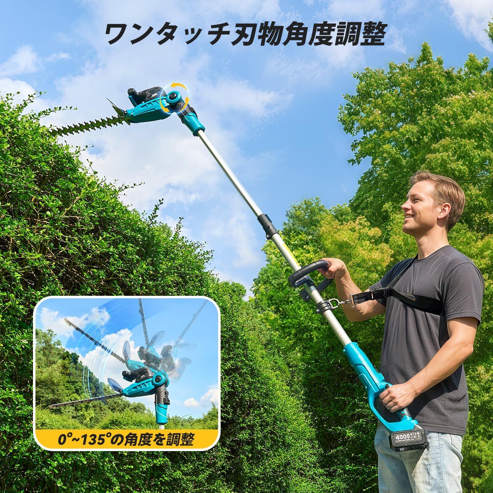 【最大 360cm の広い動作範囲を実現する】本製品は無段階で210cmから260cmまで自在に伸ばせます。これにより、お客様の身長に合わせて最大360cmの広い動作範囲を実現し、手の届きにくい場所の作業も自分で簡単に行えます。高木の刈り込みや枝払いなど、高所作業も楽々とこなせます。また、ポールヘッジトリマーのヘッド部分は0°から135°まで角度を自在に調整できます。高所や奥行きのある生け垣の剪定作業が一層スムーズに行えるのです。
