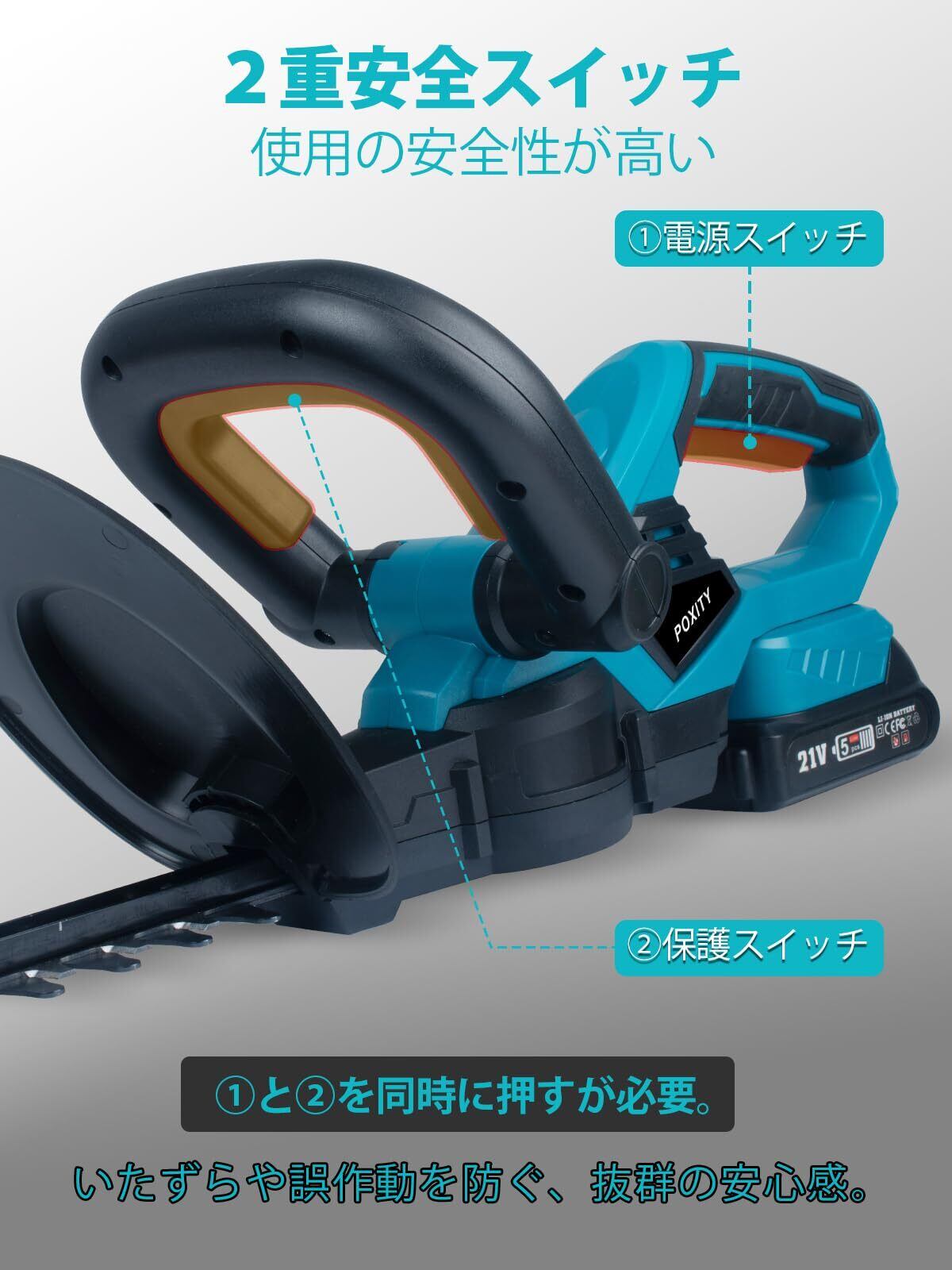 安全ロックボタン設計・ブレーキ機能:誤作動を起こしにくくする機能「トリガーロック機能」があり、ヘッジトリマーを始動する前に2つのスイッチを同時に押さないと稼動できないしくみ。意図せずトリガーを握りこんでしまった場合にも誤って作動することが起きにくいため、電動工具に普段触らない人でも安全に使用しやすくなっています。高い安全性です。